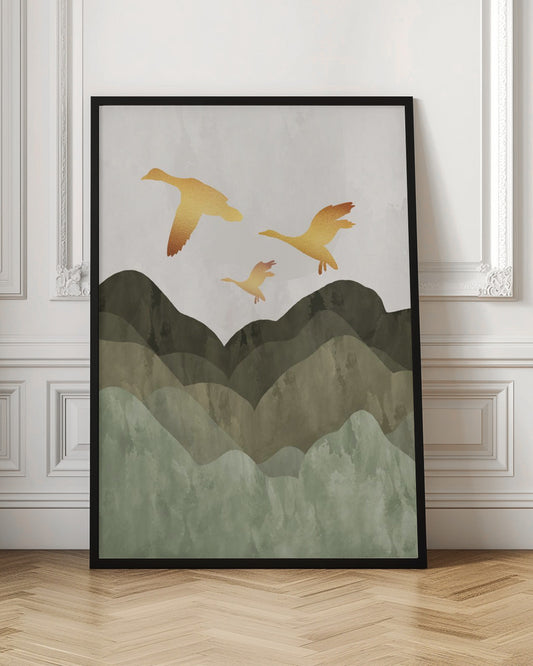 Golden Birds Flying Over Mountains - Poster / Art Print
