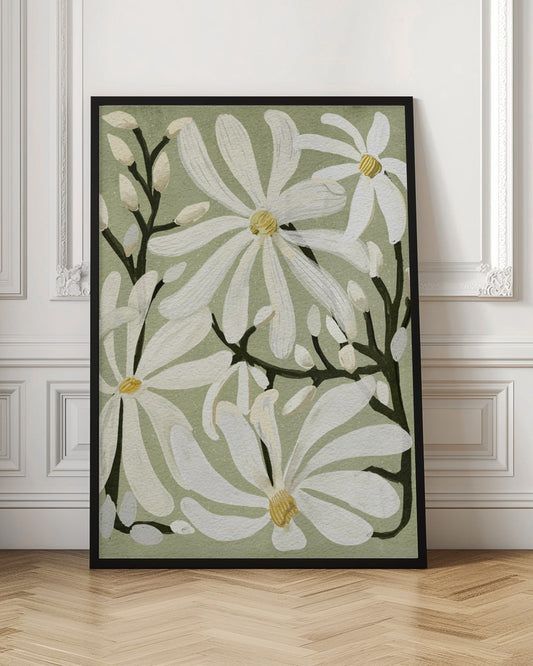 Star Magnolia Florals on Sage background - Poster / Art Print