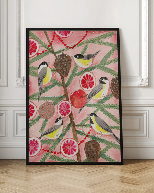 Winter birds Tits in the pine tree at Christmas - Poster / Art Print