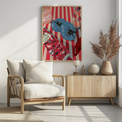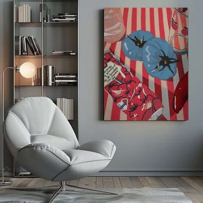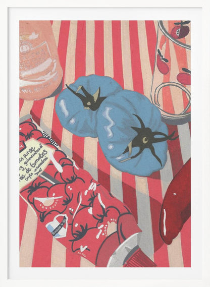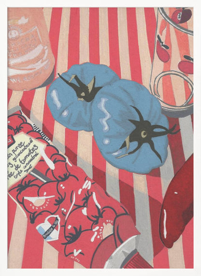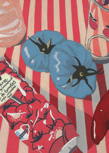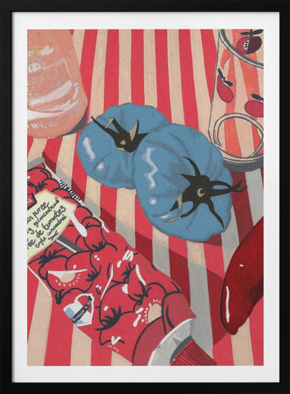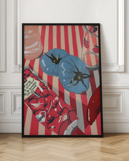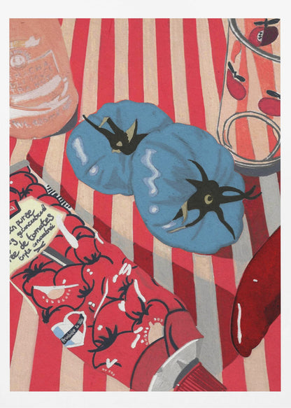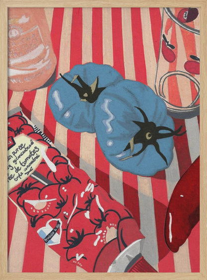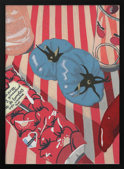 Let Studio Mandariini brighten your kitchen with the unique "Blue Tomatoes" poster. This artistic illustration captures the unexpected beauty of blue tomatoes, painted with vibrant brushstrokes and a modern touch. A perfect detail to add color and character to your interior, especially in the kitchen or dining area. The detailed still life with its rich hues is both delicious and eye-catching.