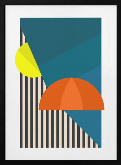 Allow us to introduce artist Frankie Kerr-Dineen with this enchanting poster, "British Weather," which captures everyday weather with an abstract and playful twist. The vibrant colors and bold geometric shapes create a modern interpretation of umbrellas and stripes, reminiscent of a stylish Bauhaus aesthetic. A perfectly colorful detail for your home!
