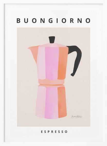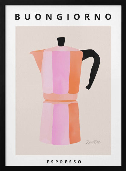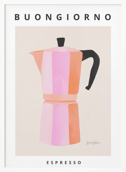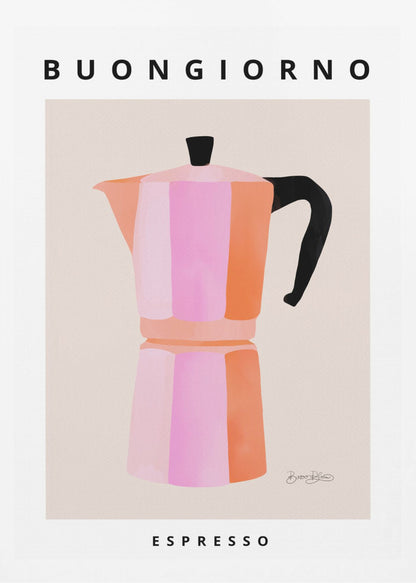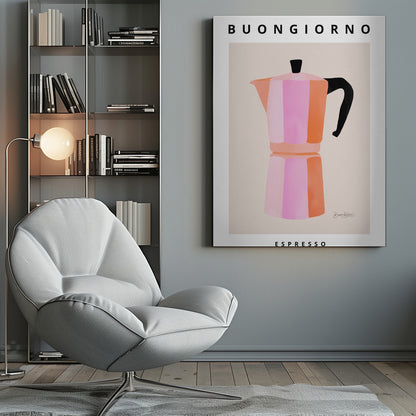 Embrace your morning ritual with this delightful "Buongiorno Espresso" art print from Baroo Bloom. This captivating poster perfectly captures the warm and inviting ambiance of an Italian morning, featuring a stylish illustration of a classic moka pot. Its soft color palette and intricate details create a timeless design, ideal for any kitchen or dining area.