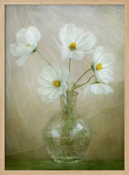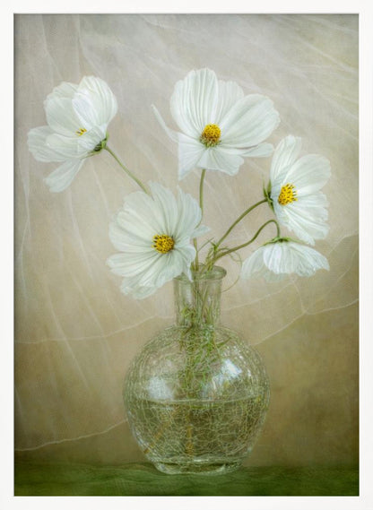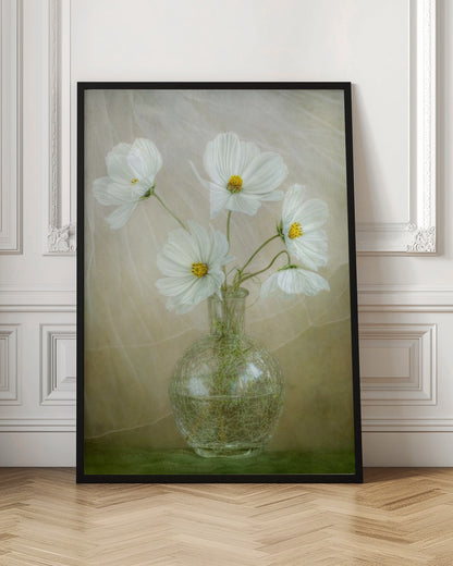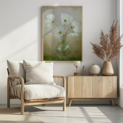 Capture serene beauty with "Cosmos breeze" by the talented artist Mandy Disher. This art print showcases a delicate bouquet of white cosmos flowers in an elegant green vase, evoking a sense of tranquility and freshness. Its soft tones and detailed composition make it a perfect addition to enhance any room.