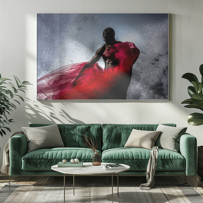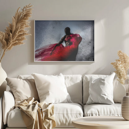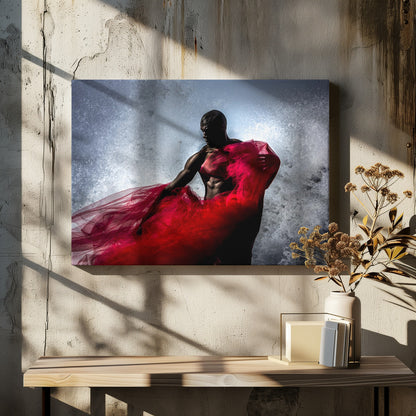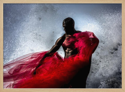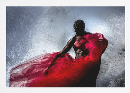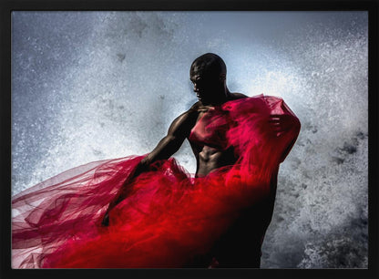 Peter Müller Photography presents "Fire and Water", a captivating poster that explores the contrast between elements and the human form. The image features a strong Black man, draped in red fabric, confronting the ocean waves. The dramatic splash of water and the flowing cloth create a dynamic and artistic composition that truly captures the eye.