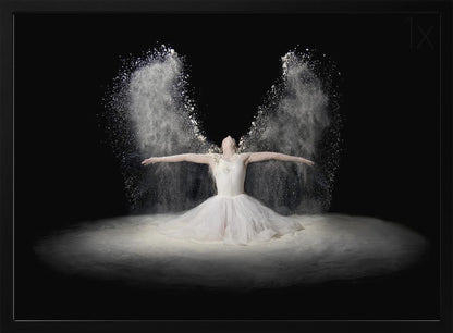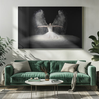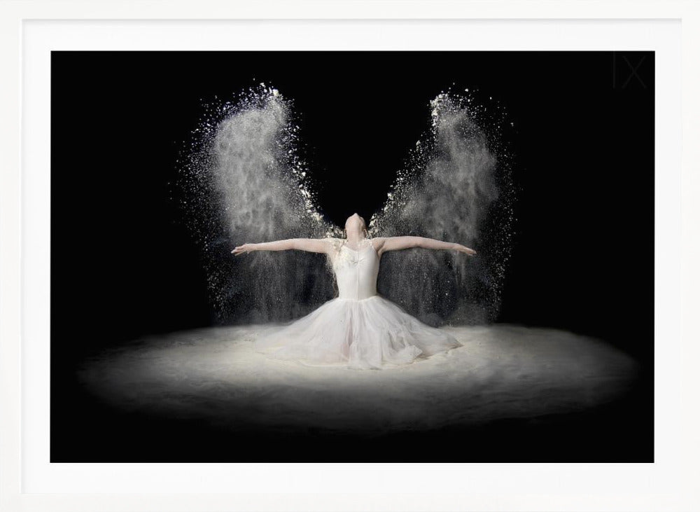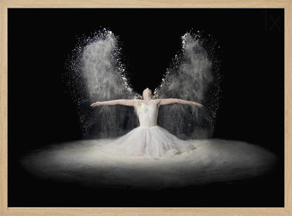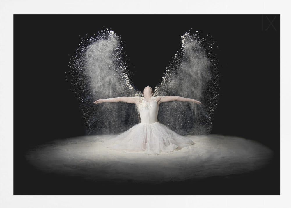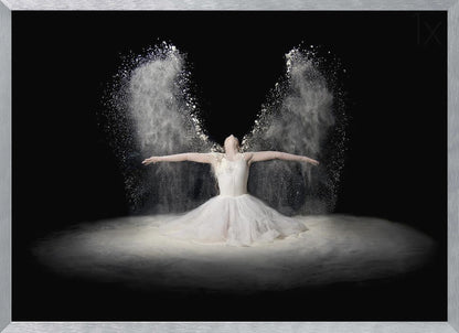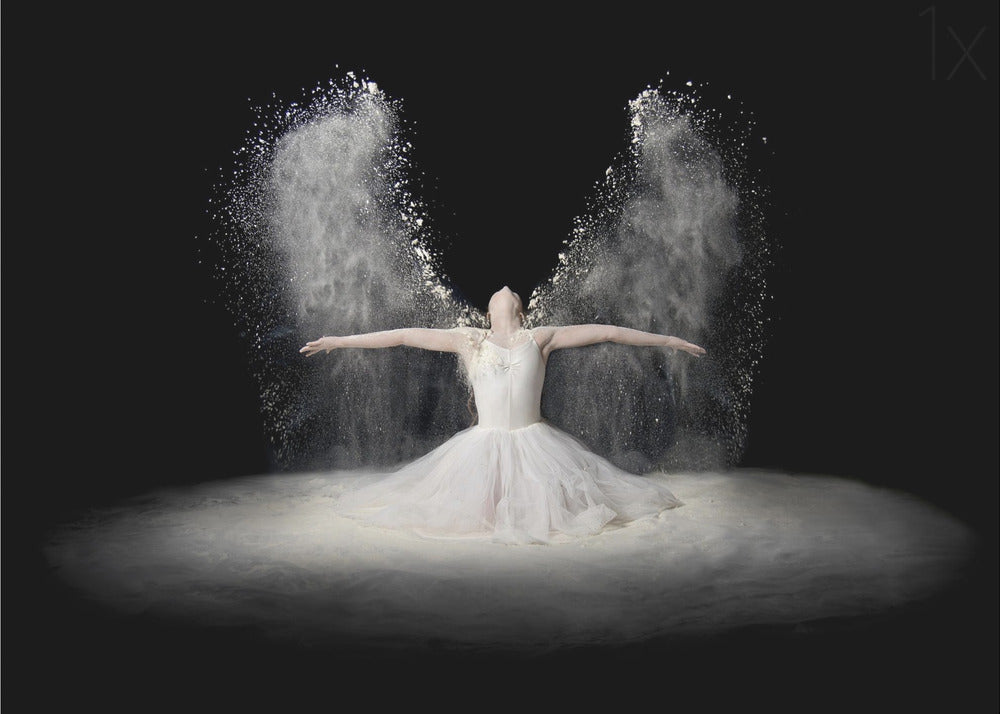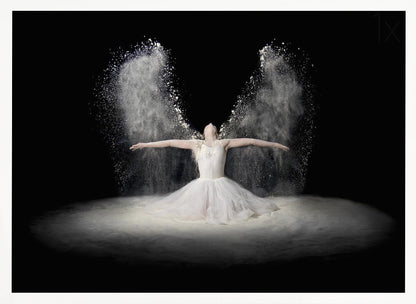 Pauline Pentony MA ARPS DPAGB proudly presents 'Flour Wings', an enchanting poster and art print that captures the ethereal beauty of ballet. This surrealistic piece depicts a dancer in a bridal-like gown, whose arms scatter a veil of flour that transforms into powerful wings. It's a creative edit conveying flight, dance, and a dreamlike fantasy.