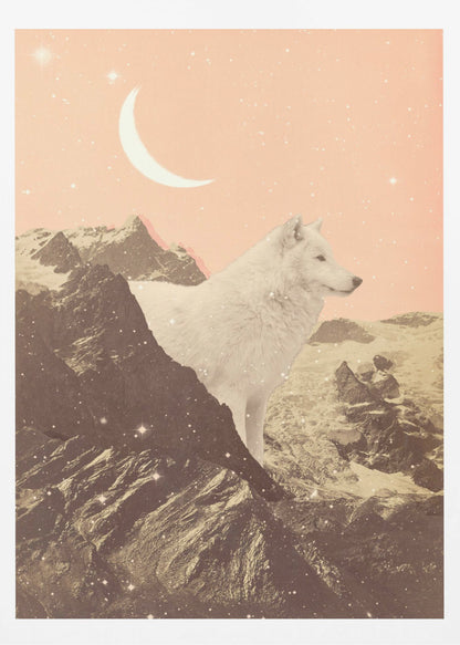 Be captivated by Florent Bodart's unique artwork, "Giant White Wolf In Mountains," a surreal poster transporting you to a mystical mountain world. This artistic illustration features a majestic white wolf set against a dreamy landscape of towering mountains and a starry night sky. Bodart's creative editing crafts a captivating composition that is both powerful and atmospheric, perfect for adding a touch of surreal magic to your space.
