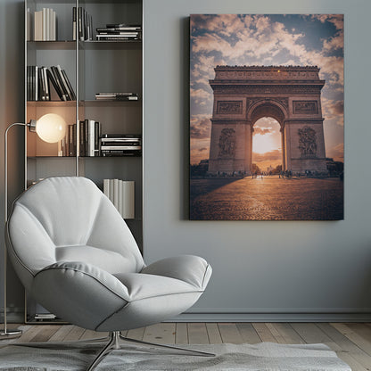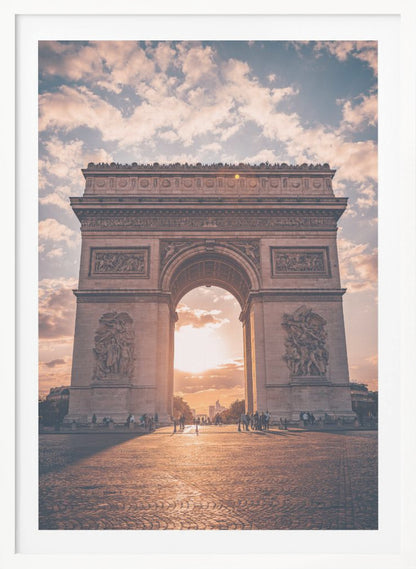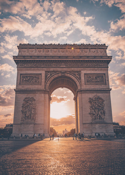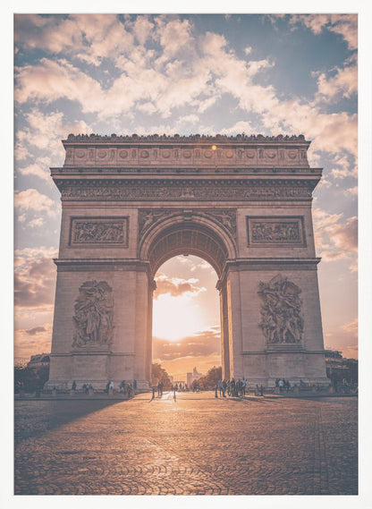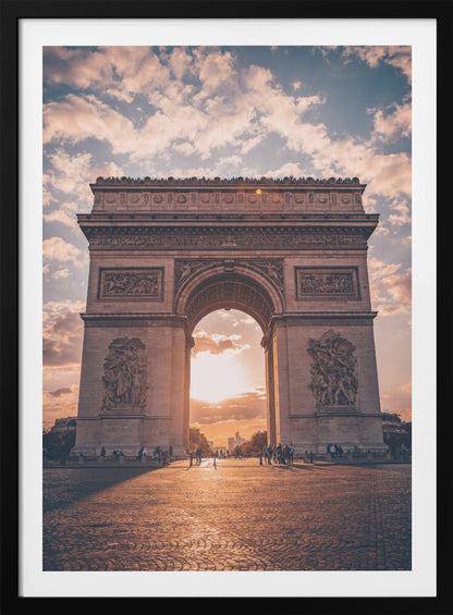This magnificent poster, created by artist Behdad Pournader, captures the iconic Arc de Triomphe in Paris during a magical golden hour. Warm light bathes the grand architecture and sky, while people gather in the foreground, creating a sense of life and movement. A timeless piece of art that transforms any wall.