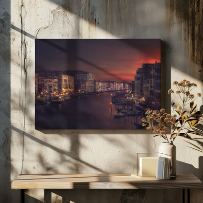 The artwork highlights the city's unique atmosphere and the tranquil movement on the water. With a palette that emphasizes reds and warm tones, an inviting and mysterious feeling is created, perfect for adorning any wall.