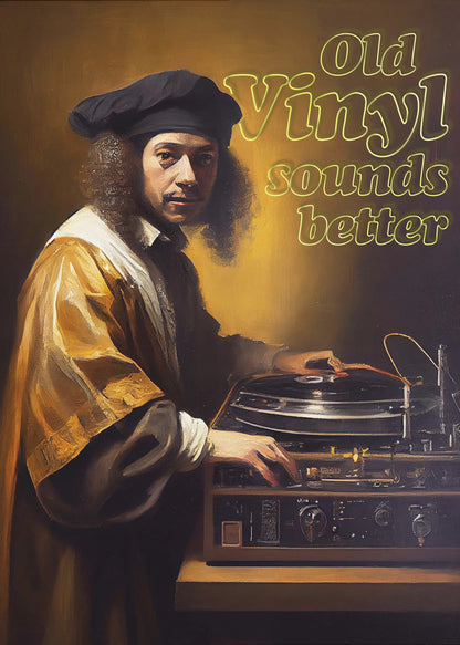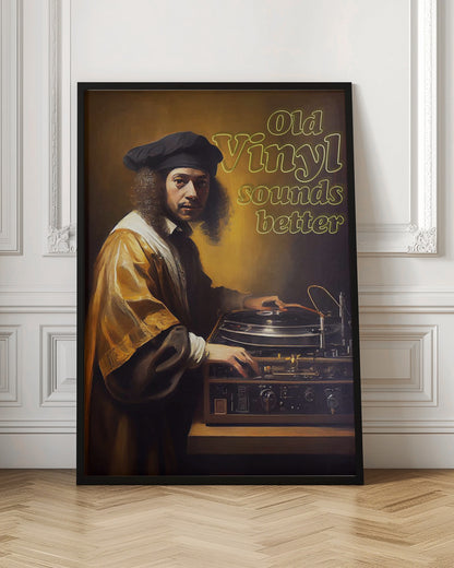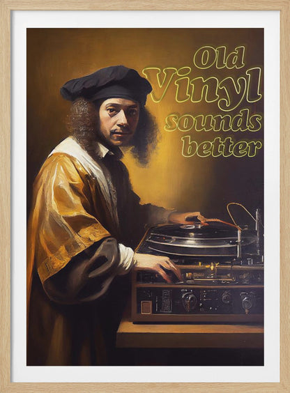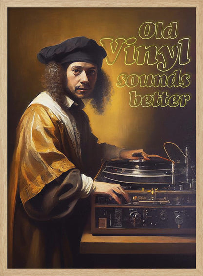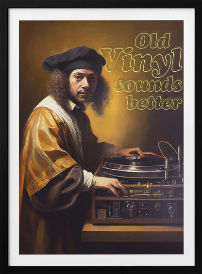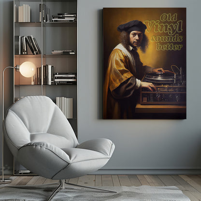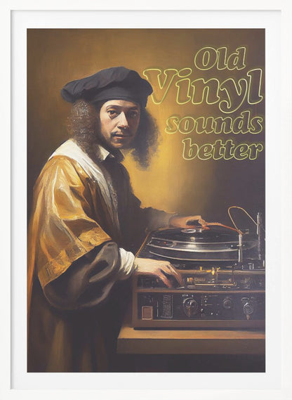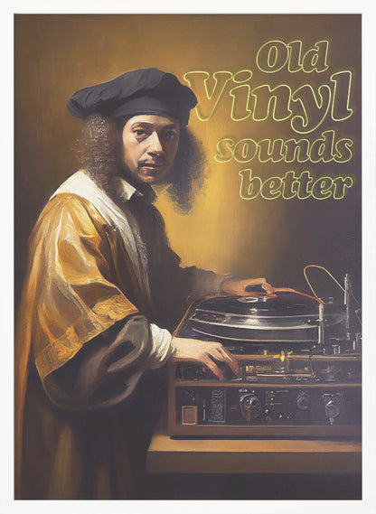 "Old Vinyl Sounds Better" is a vibrant art print by Dikhotomy that celebrates the timeless charm of vinyl. This playful piece combines baroque elements with pop art influences, creating a humorous and thought-provoking image. The visual dichotomy between classic portraiture and modern music technology captures the eye with its vivid brush strokes and neon colors. A perfect homage to music lovers.