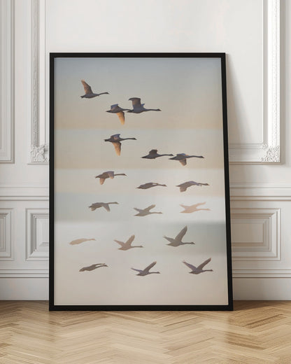 This captivating poster by Leif Løndal captures the moment swans majestically stretch towards the setting sun. The artwork, "Past the sun.", radiates a sense of calm and movement. Its graphic style and the dynamic composition of the birds in formation against the bright sky create a timeless image of nature's beauty and the perpetual journey.