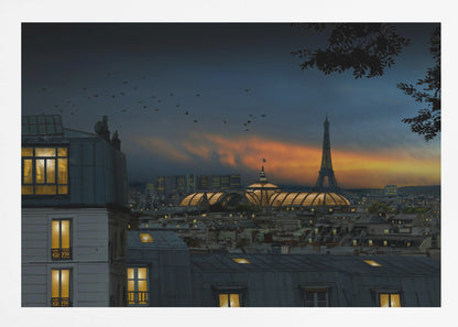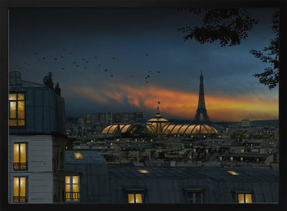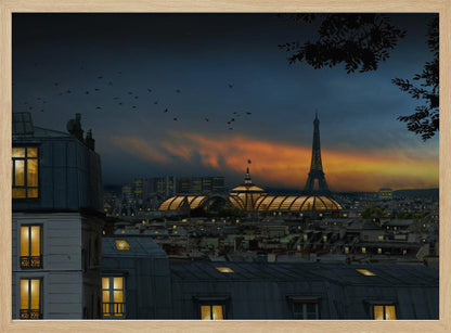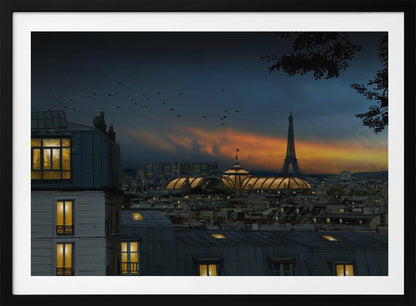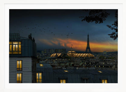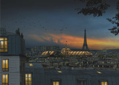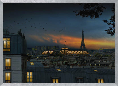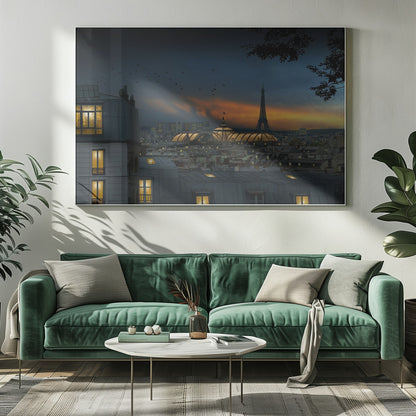 Capture the breathtaking beauty of Paris rooftops at blue hour, masterfully rendered by photographer Pierre Bacus. This art print offers an enchanting view of the city's iconic landmarks, with the Eiffel Tower majestically rising against a deep blue twilight sky. The architectural details and soft lighting create an almost dreamy and romantic atmosphere that will enhance any room.