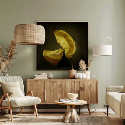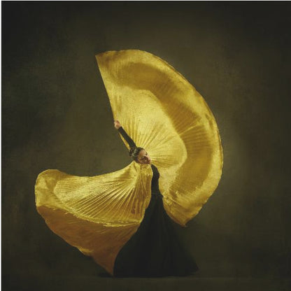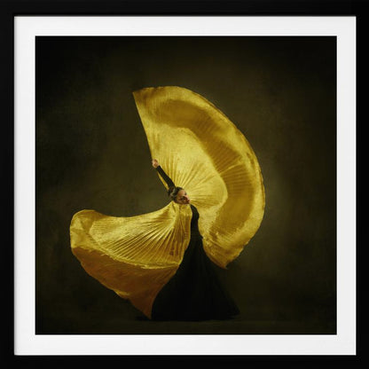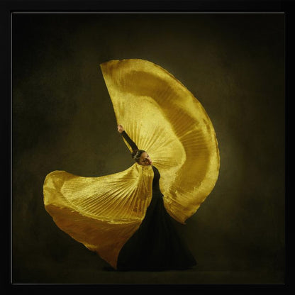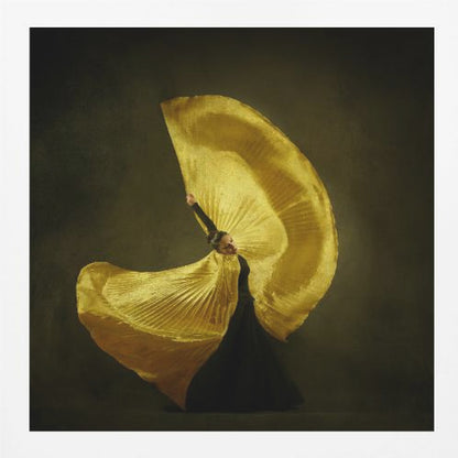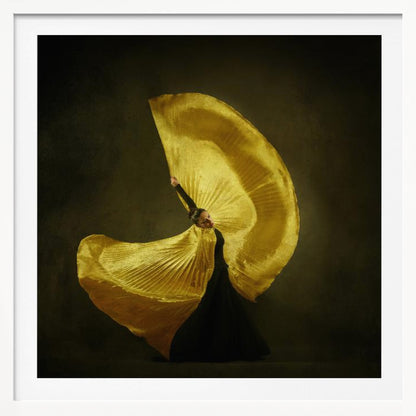 Be enchanted by Moein Hasheminasab's captivating work "The girl & dance", a poster celebrating the dynamic beauty of movement. This artwork depicts a graceful dancer in a radiant gold-yellow dress, its fabric folding like wings. The figurative portrait exudes elegance and a sense of freedom, perfect for adding an artistic touch to your home.