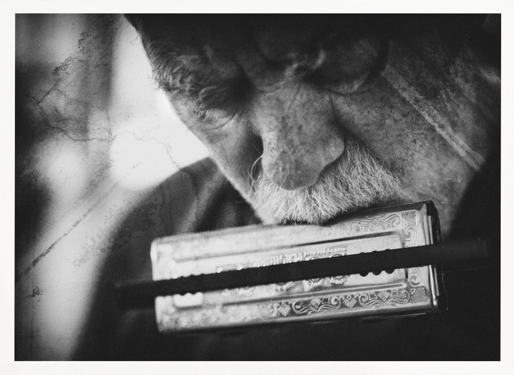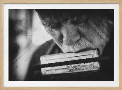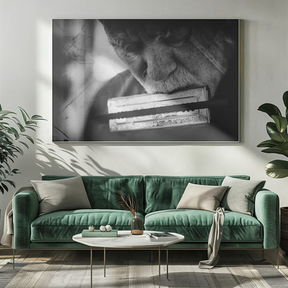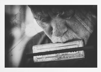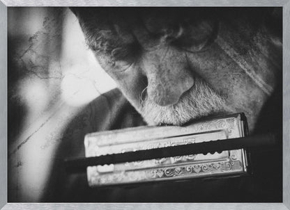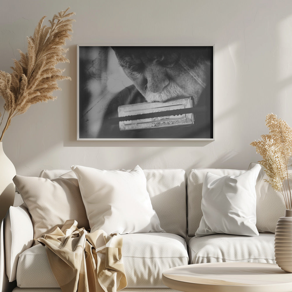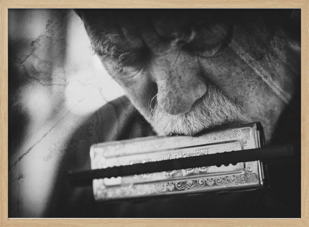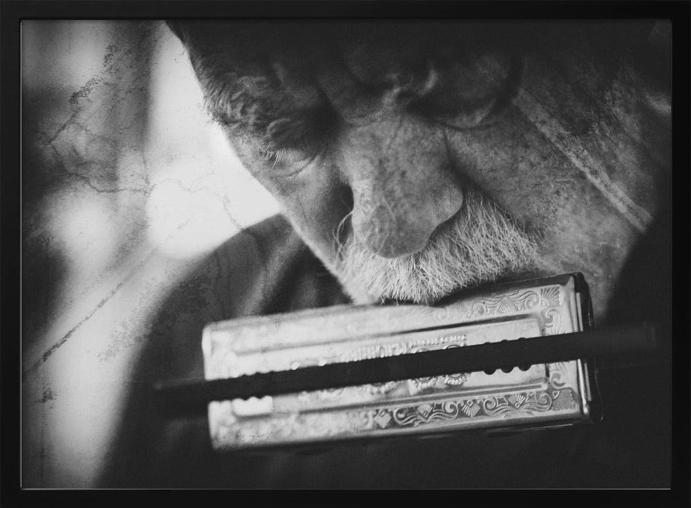 Delve into the emotion with "Wolf with harmonica", a captivating piece by Roswitha Schleicher-Schwarz. This black and white poster captures the intense concentration of an older man playing the harmonica, a street performer sharing his soul through music. The image radiates a raw, genuine feeling and timeless charm, perfect for adding character to your home.