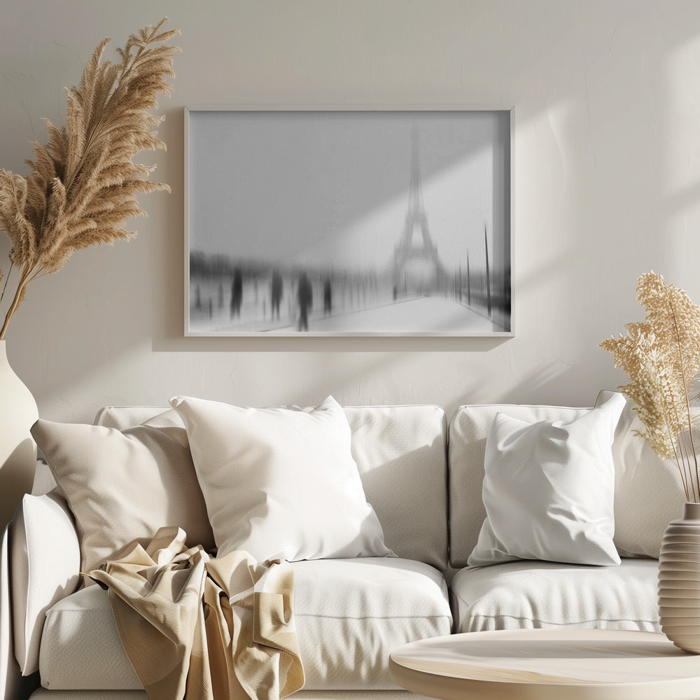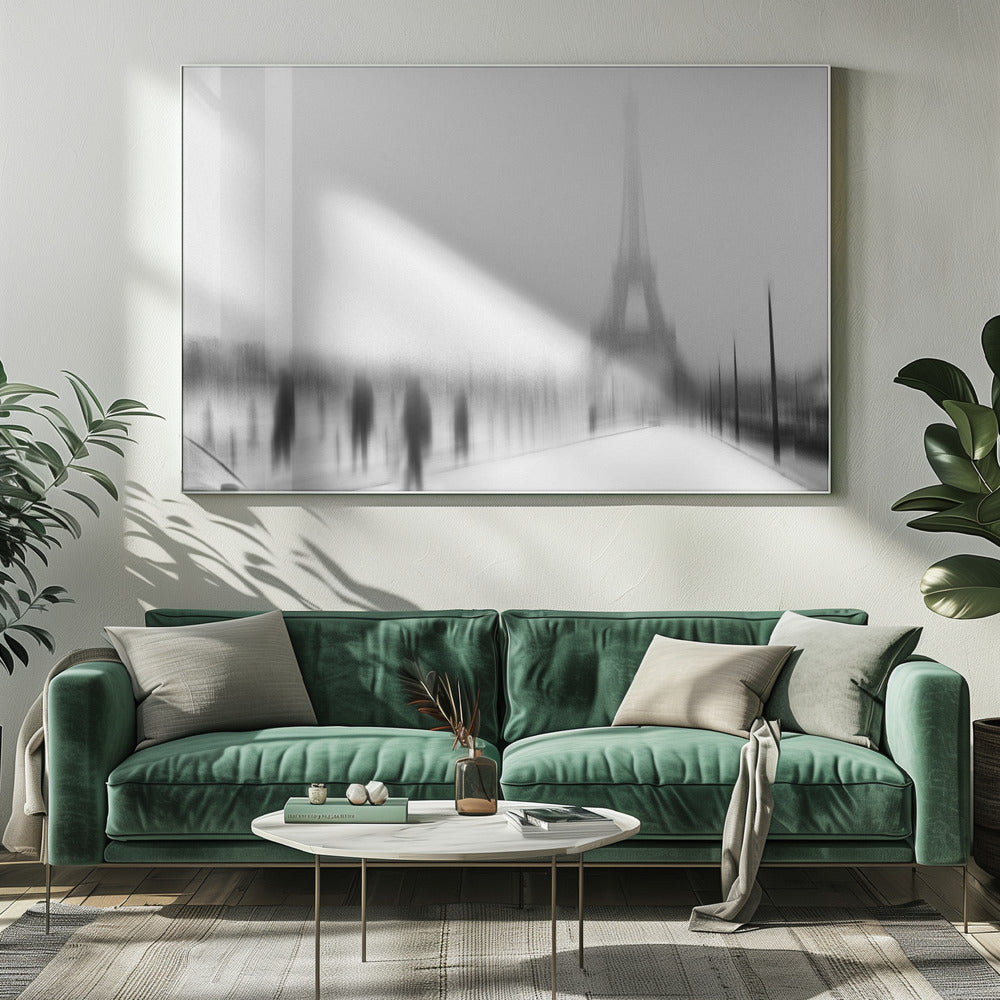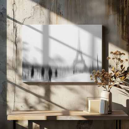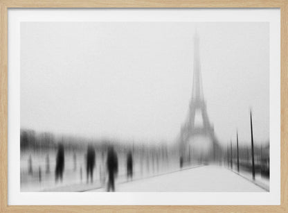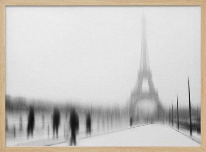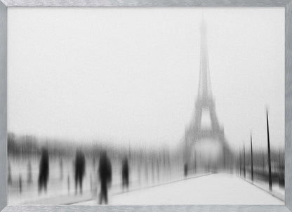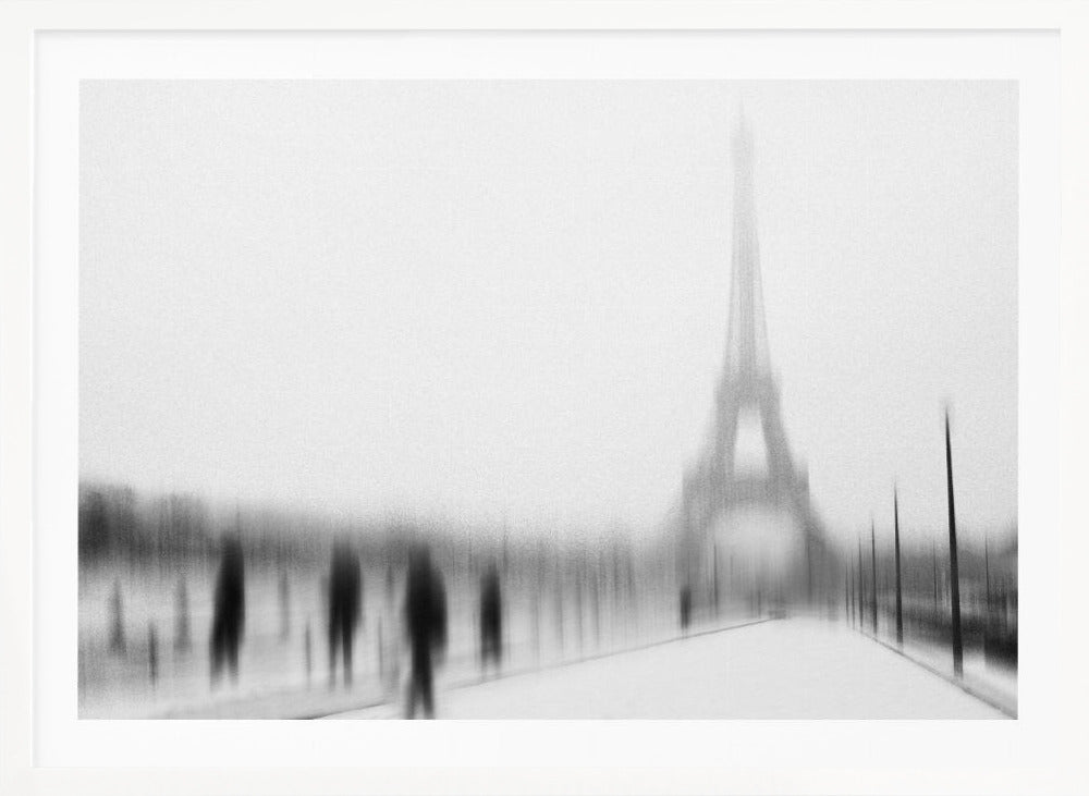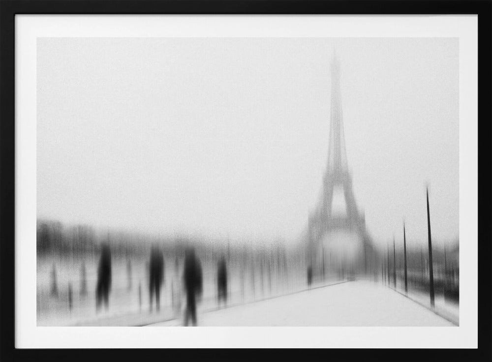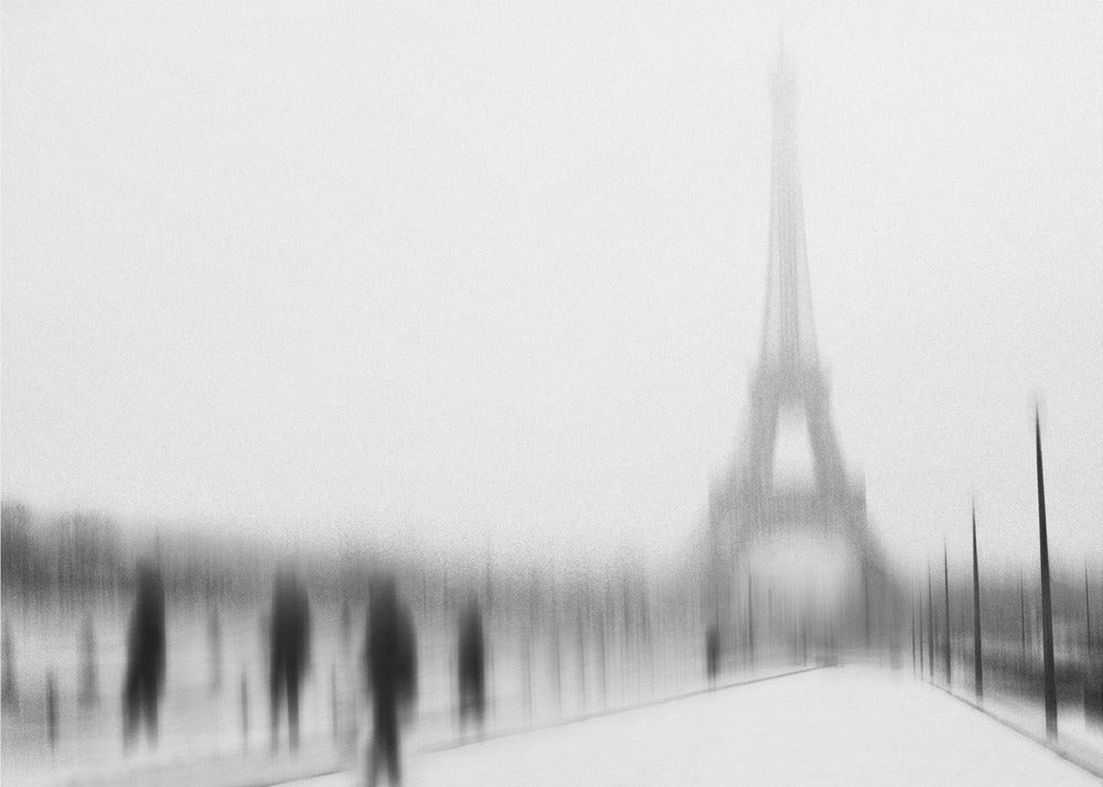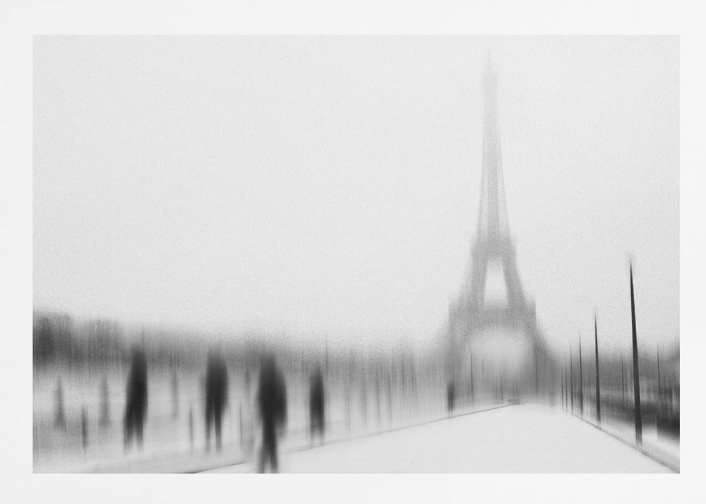 Eric Drigny fångar essensen av en kall vinter i Paris med detta suggestiva konsttryck. Bilden, med sitt suddiga och nästan spöklika Eiffeltorn, erbjuder en unik och drömsk tolkning av den ikoniska arkitekturen. Den svartvita paletten förstärker känslan av frostig mystik och en stilla, snöig stadsvinter. Perfekt för att addera en touch av urban melankoli till ditt hem.