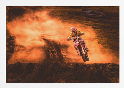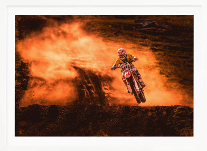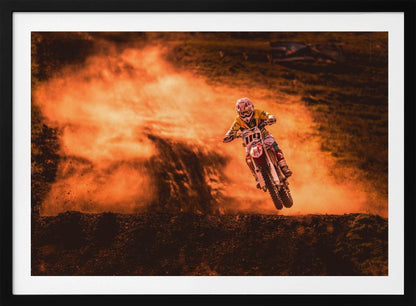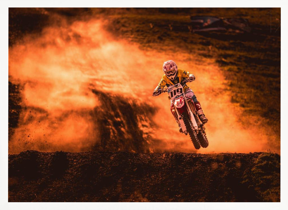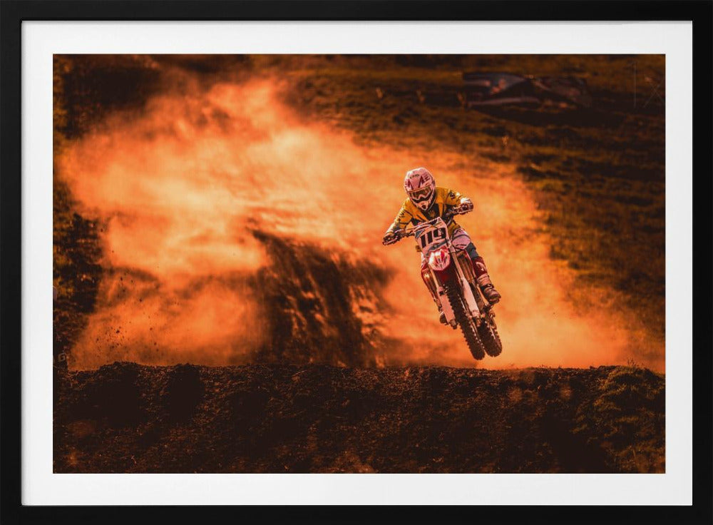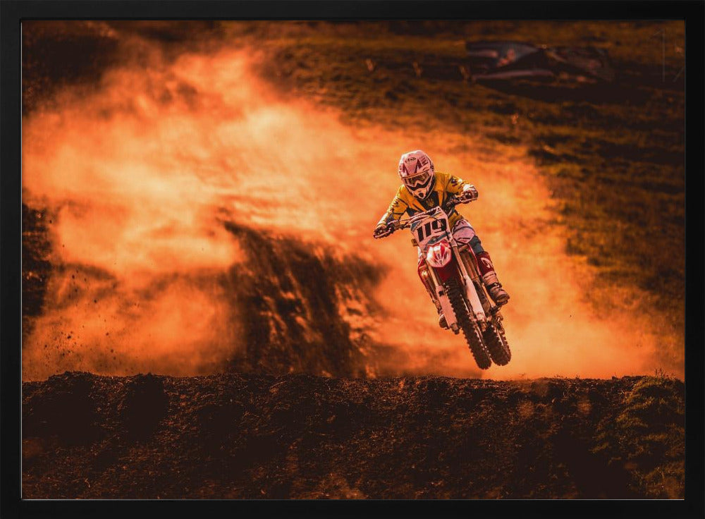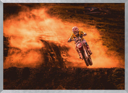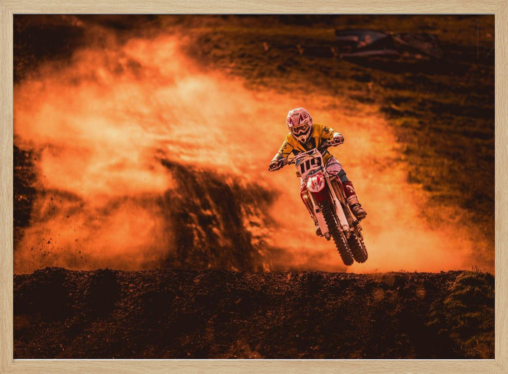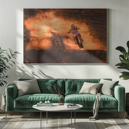 Låt dig inspireras av Salkov Igors dynamiska verk "above", en poster som fångar ögonblicket av ren adrenalin och frihet. Denna konstnärliga bild skildrar en våghalsig cyklist i ett spektakulärt hopp, inbäddad i gyllene damm och hastighet. En perfekt representation av extrem sport och den obotliga lusten att utmana gränserna.