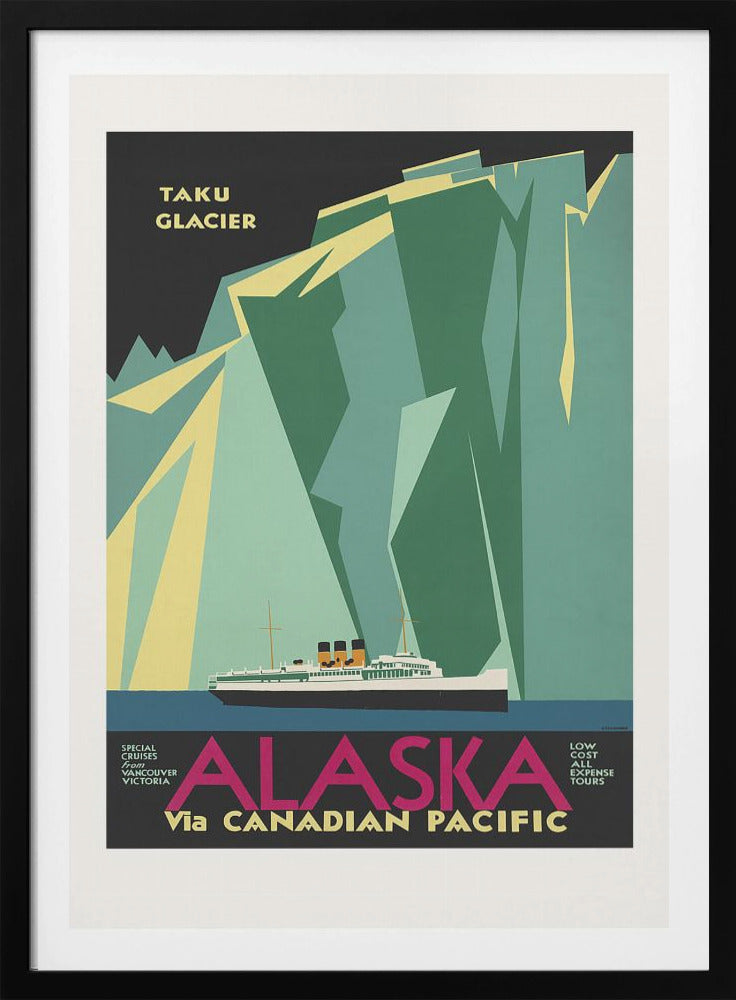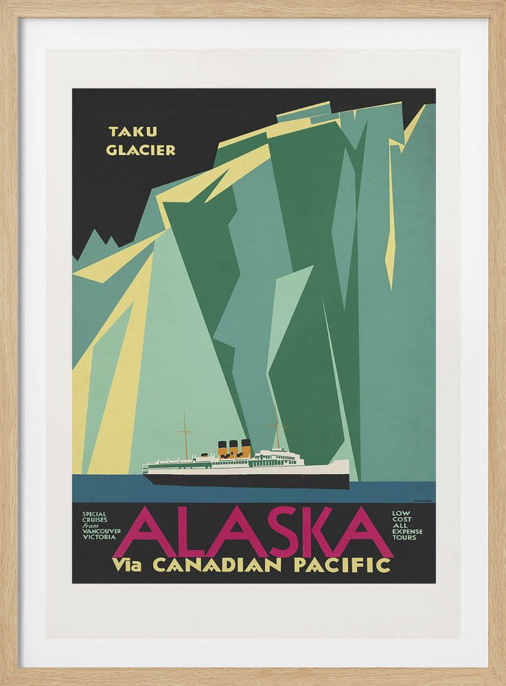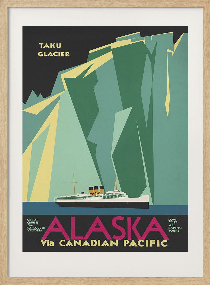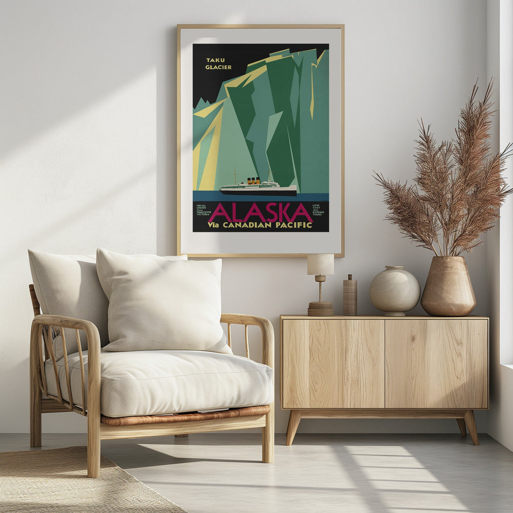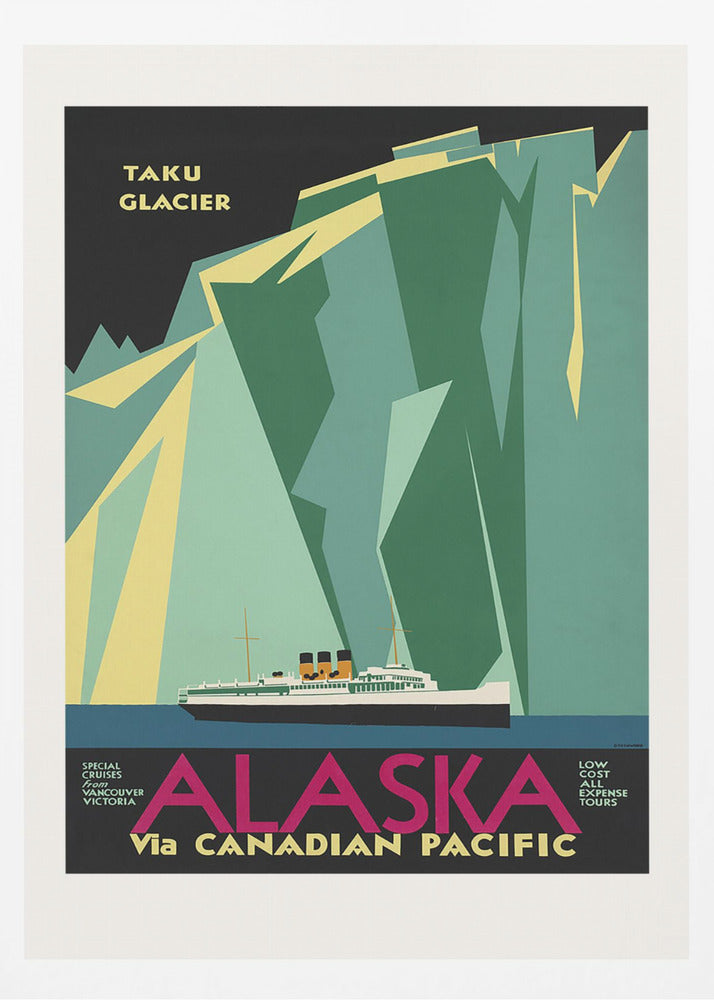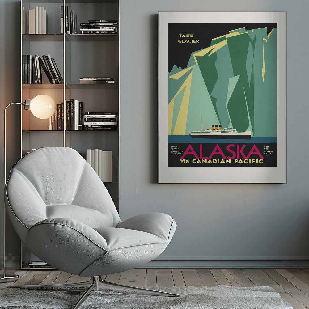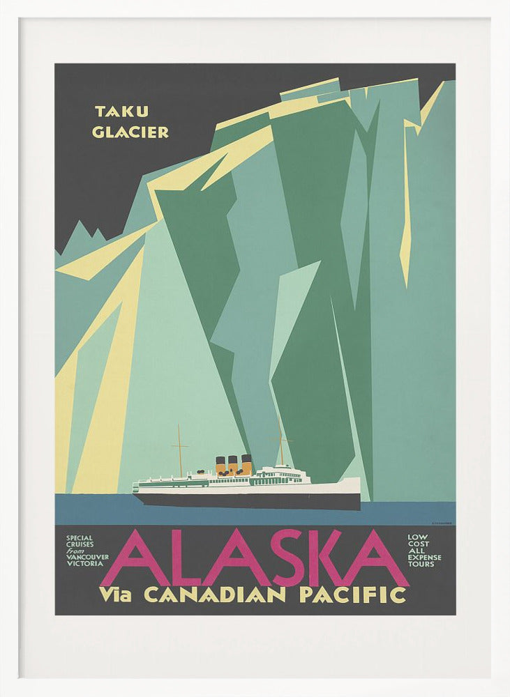 Vintage Travel Poster presenterar denna ikoniska affisch, "Alaska Via Canadian Pacific. Taku Glacier". Detta fantastiska konsttryck fångar den majestätiska skönheten i Alaskas isiga landskap och Kanadas vildmark. Den färgstarka retrodesignen med en båt och snöiga scener inbjuder till äventyr och nostalgi. Ett inspirerande tillskott till varje vägg som älskar resor och tidlös konst.