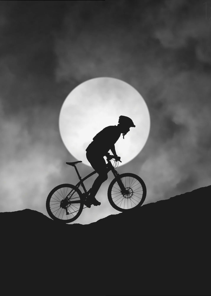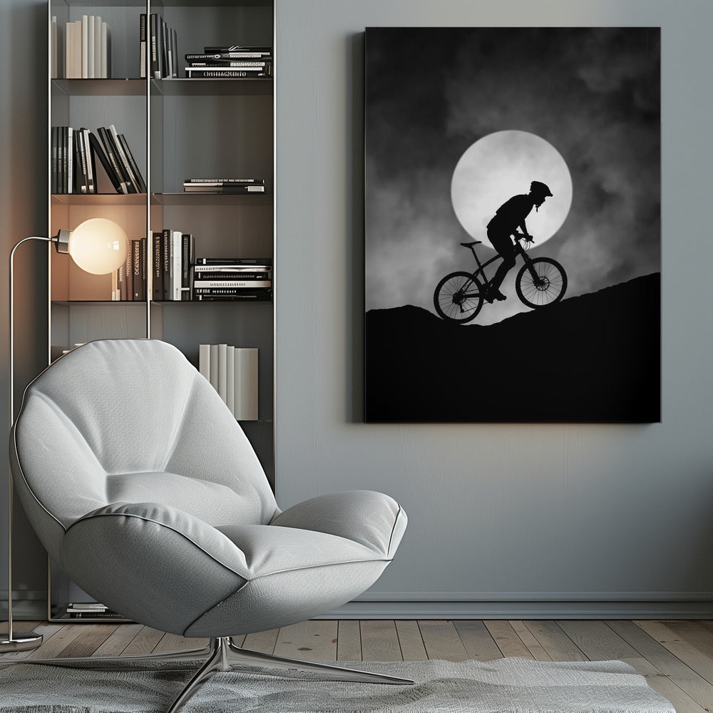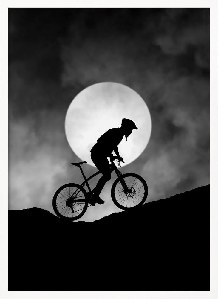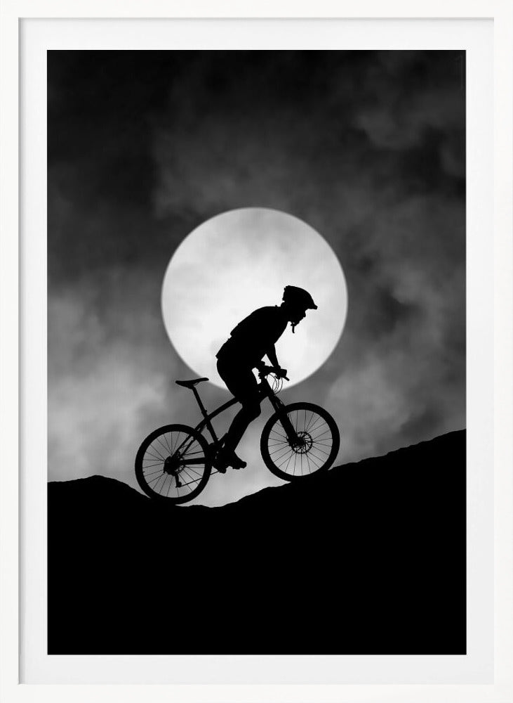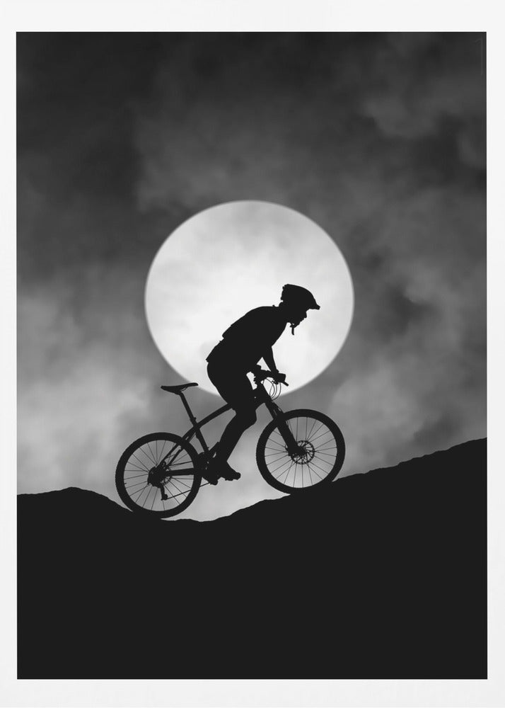 Hengki Lees fängslande verk "Allegro" är en dynamisk poster som omedelbart drar in betraktaren i en värld av adrenalin och äventyr. Den surrealistiska siluetten av en mountainbikecyklist som trotsar gravitationen under en månnatt skapar en känsla av extrem handling och spänning. Konstverket är en mästerlig komposition av kontrast och mystik, perfekt för dig som älskar sport och oväntade perspektiv.