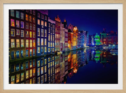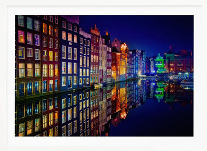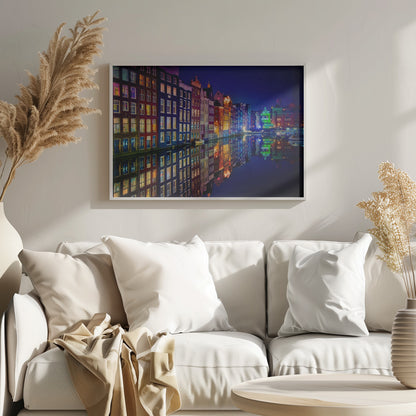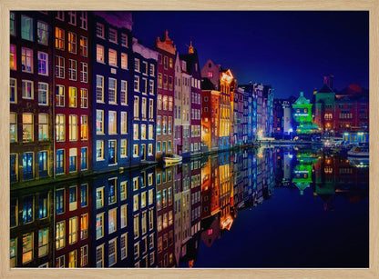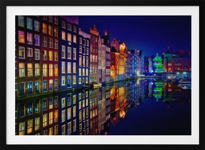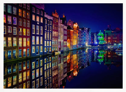 Låt dig förföras av Juan Pablo de Miguels fascinerande tolkning av Amsterdams nattliga charm. Denna poster fångar stadens ikoniska kanaler och arkitektur i ett levande färgspel, där gatans ljus speglar sig i vattnet och skapar en magisk atmosfär. En perfekt tavla för att ge ditt hem en touch av urban elegans och färgstark dynamik.