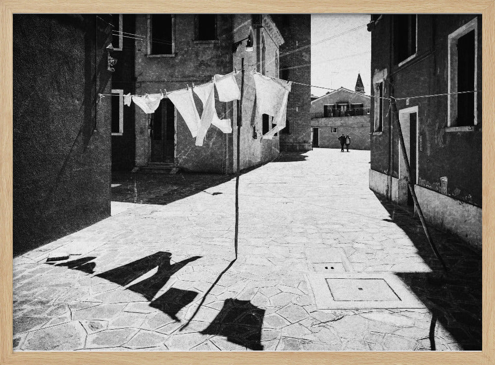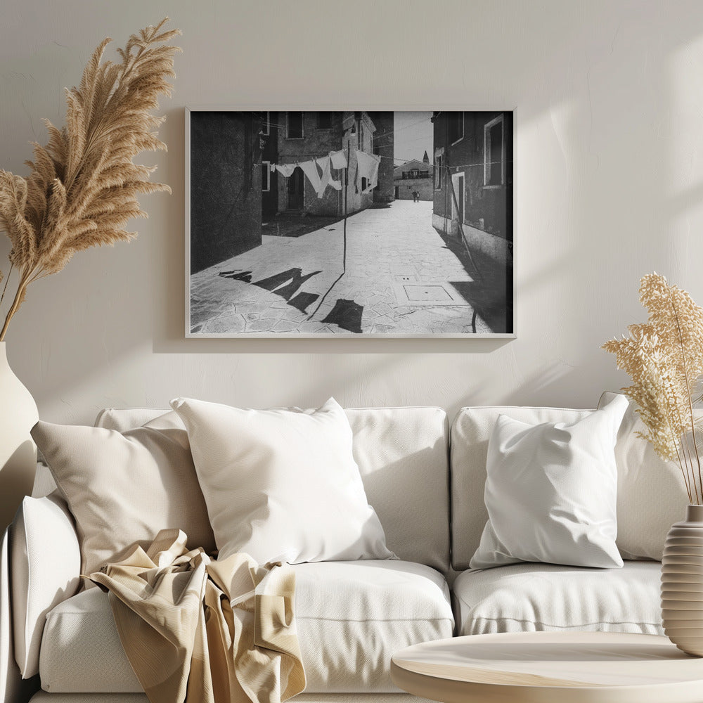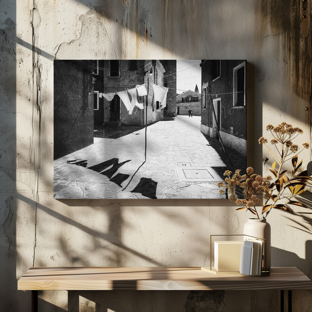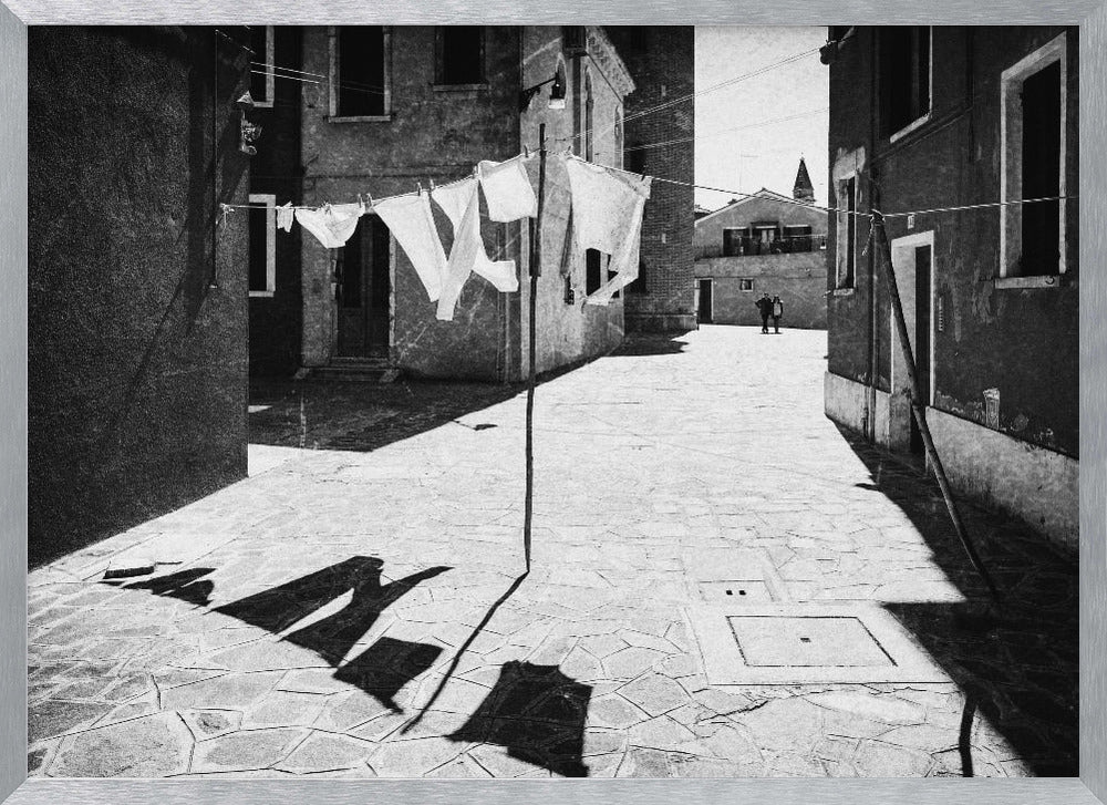 Denna fängslande poster, "as time stands still", av Roswitha Schleicher-Schwarz, transporterar dig till Buranos charmiga gator i Venedig. I denna tidlösa svartvita komposition fångas det dagliga livet med kläder som torkar i solljuset och skuggor som leker över gamla dörrar och fönster på byggnader. Det är en perfekt hyllning till italiensk arkitektur och gatuliv.