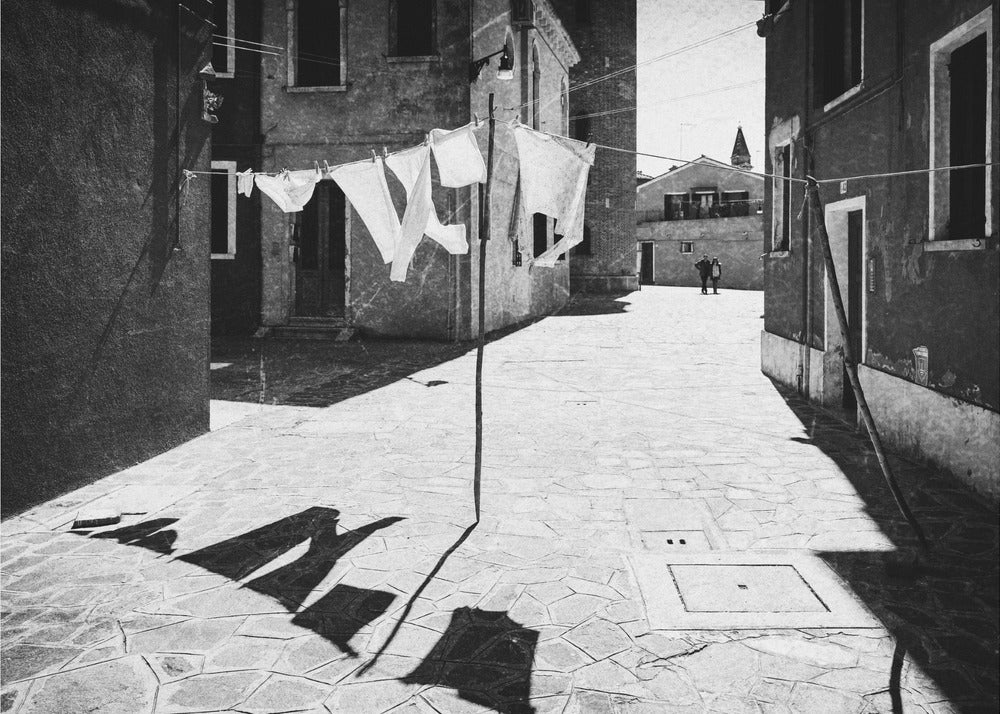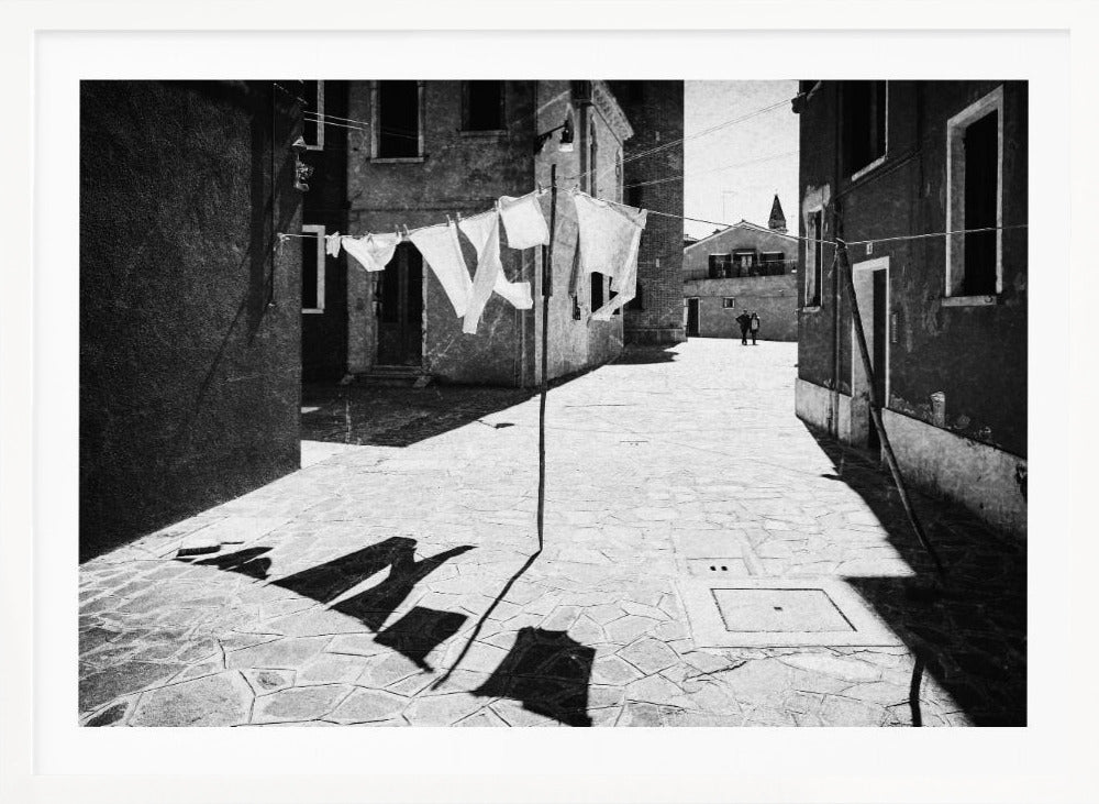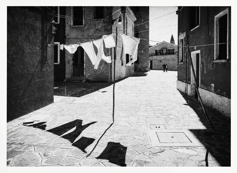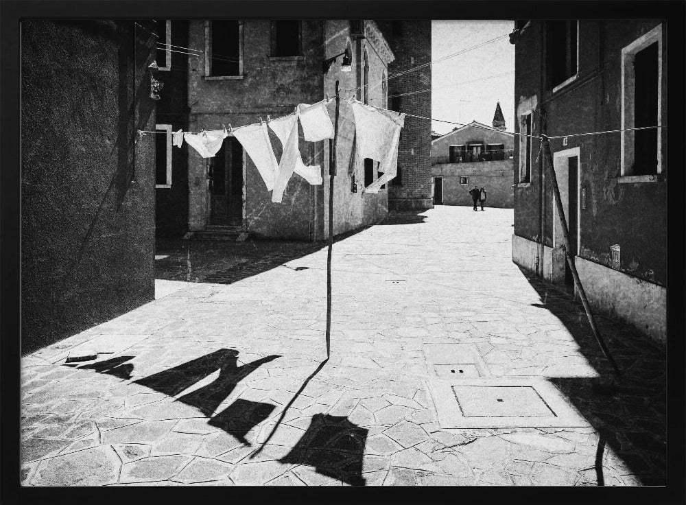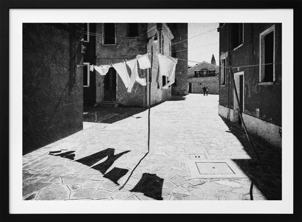 Denna fängslande poster, "as time stands still", av Roswitha Schleicher-Schwarz, transporterar dig till Buranos charmiga gator i Venedig. I denna tidlösa svartvita komposition fångas det dagliga livet med kläder som torkar i solljuset och skuggor som leker över gamla dörrar och fönster på byggnader. Det är en perfekt hyllning till italiensk arkitektur och gatuliv.