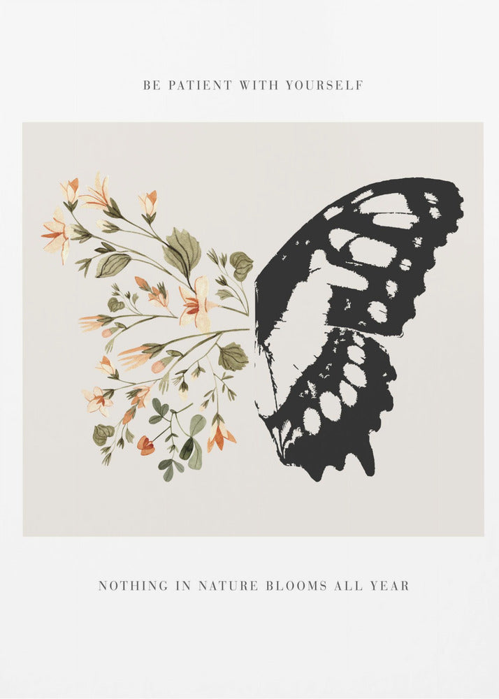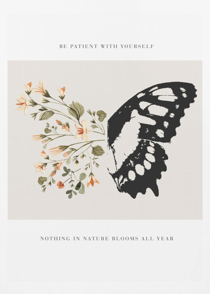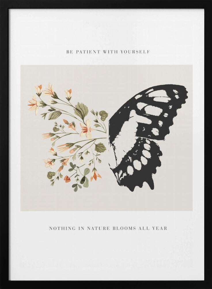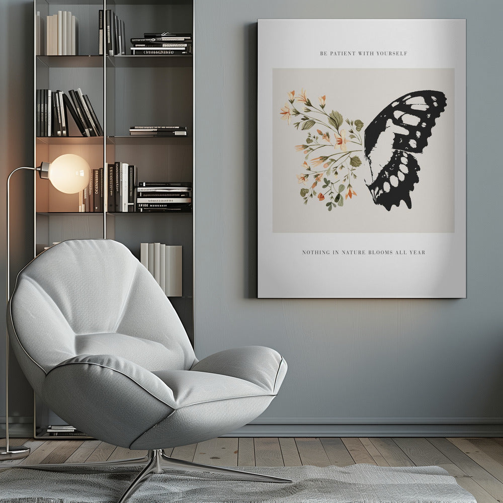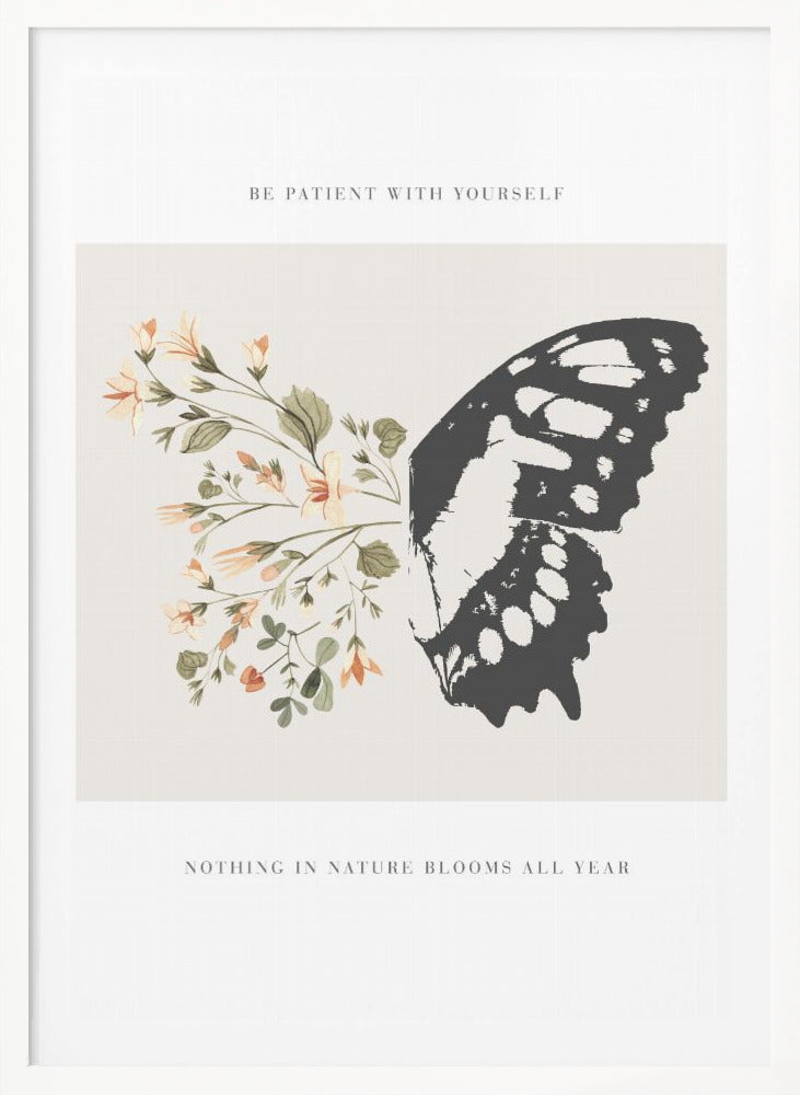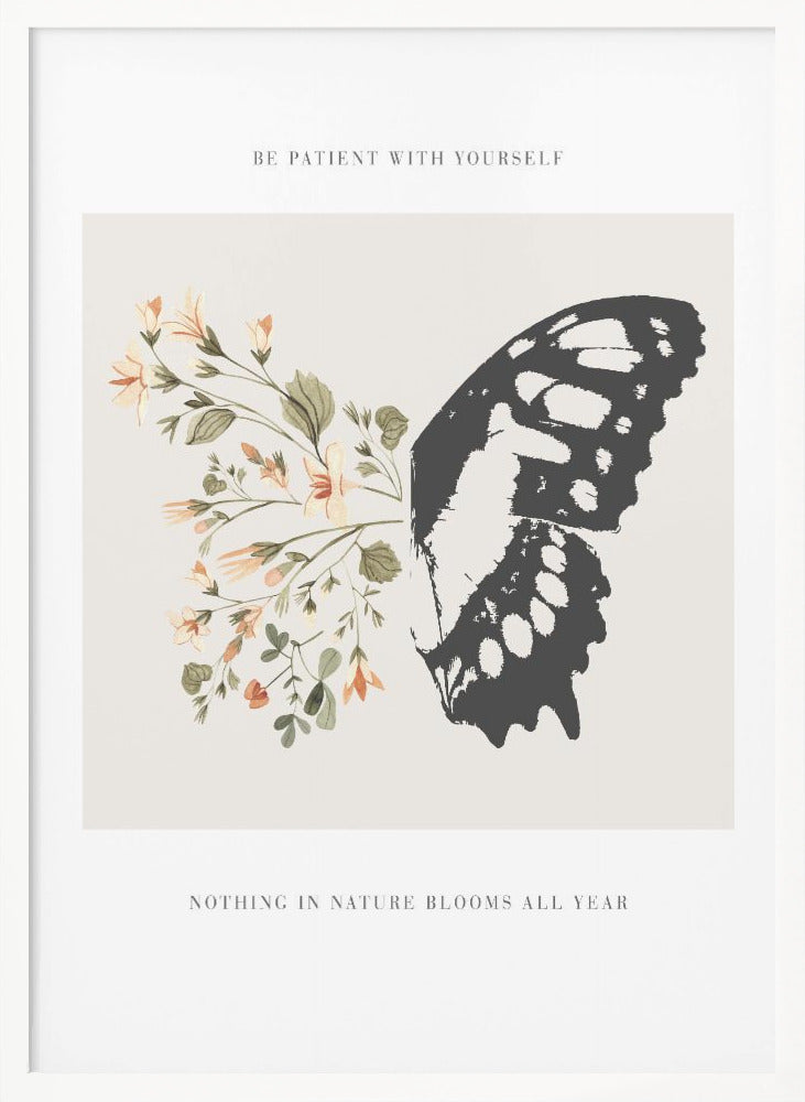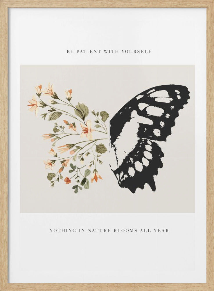 Designad av den talangfulla konstnären KsanaKalpa, fångar postern 'Be Patient' essensen av lugn och tillväxt. Denna vackra konstposter presenterar en detaljerad illustration av en fjäril som vilar bland blommande flora, akompanjerad av det tröstande budskapet 'Be Patient'. De mjuka färgerna och den detaljerade designen skapar en harmonisk känsla som påminner oss om vikten av tålamod och naturens cykler.