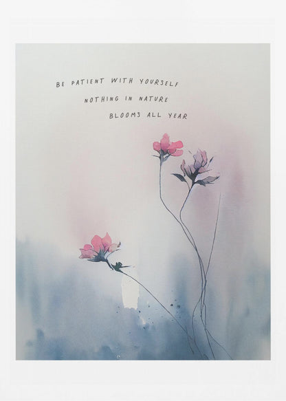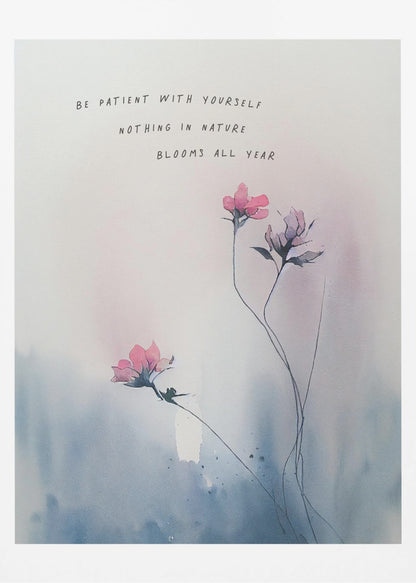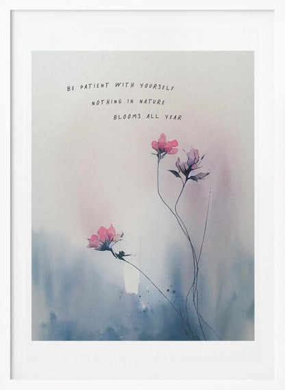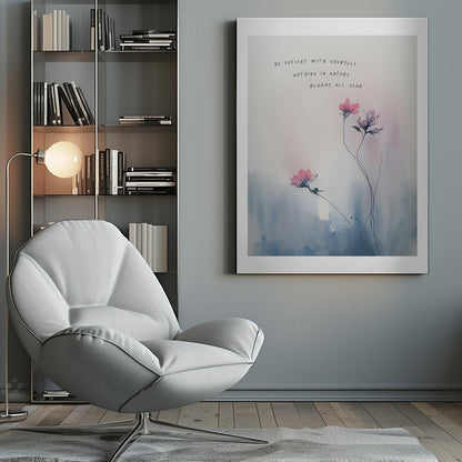 Skapad av KsanaKalpa, denna underbara poster "Be patient with yourself" är en påminnelse om vikten av självmedkänsla och personlig tillväxt. De mjuka akvarellfärgerna och de skira blommotiven skapar en lugnande estetik, perfekt för att förmedla ett inspirerande budskap. Denna tavla kombinerar botanisk skönhet med ett stärkande citat, idealiskt för ditt hem eller kontor.