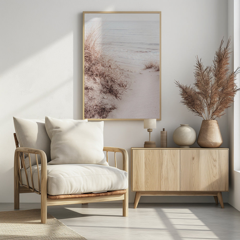 Detta fängslande verk från Pictufy Studio III fångar den lugna skönheten hos en nordisk sandstrand. Med en mjuk färgpalett och high-key-belysning framhävs sanddynerna och det vajande gräset i en rofylld havsmiljö. En perfekt tavla för att skapa en avkopplande atmosfär i ditt hem.