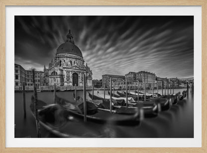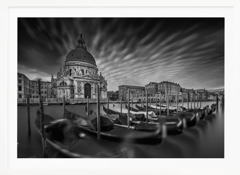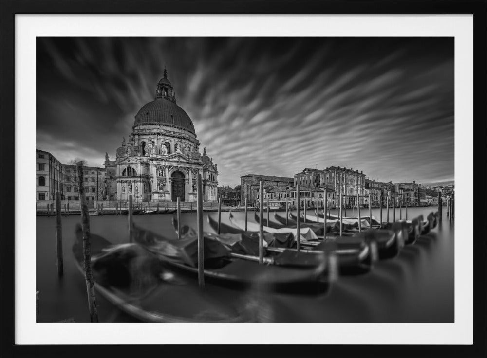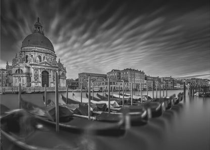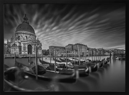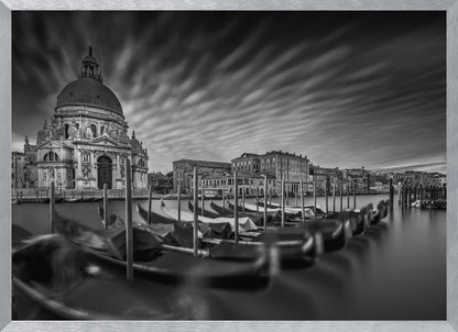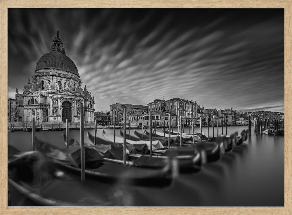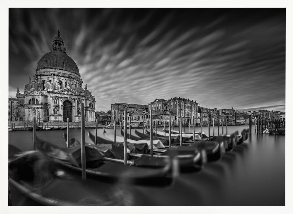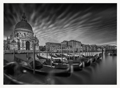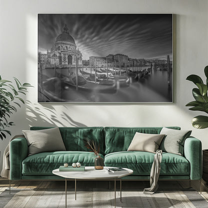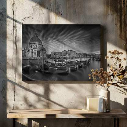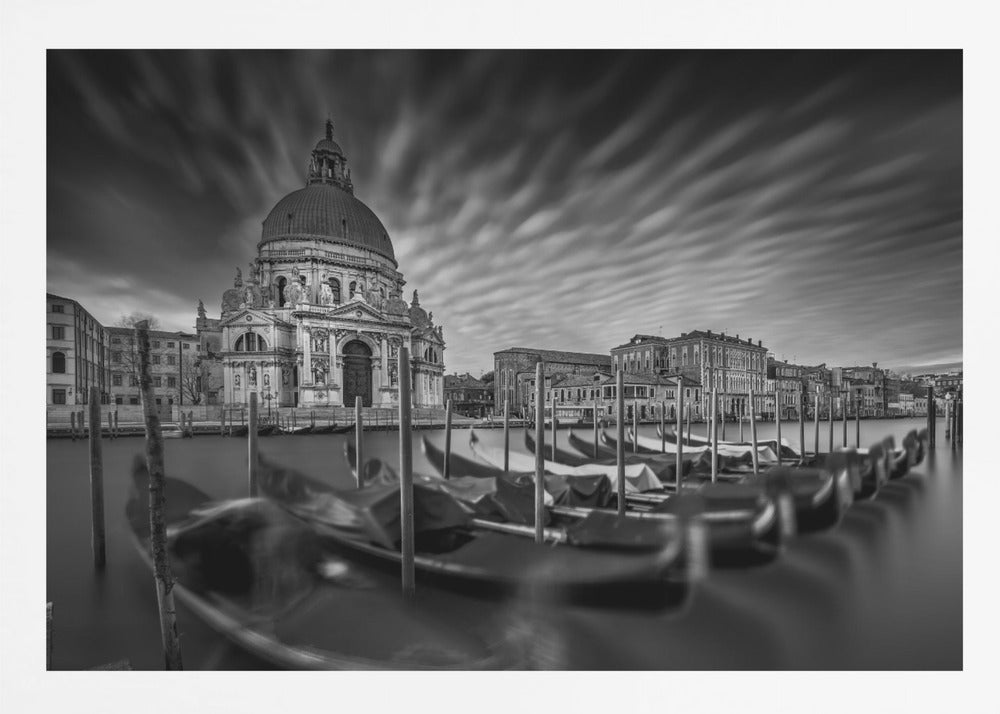 Denna enastående poster, skapad av Sven Kohnke, fångar essensen av Venedigs ikoniska Canale Grande med en fascinerande svartvit estetik. Hans skickliga användning av lång exponering skapar en drömsk och lugn atmosfär, där vattnets rörelse blir till silkeslena slöjor och de gamla byggnaderna står majestätiskt stilla. Ett tidlöst konstverk som framhäver stadens klassiska arkitektur och unika charm.
