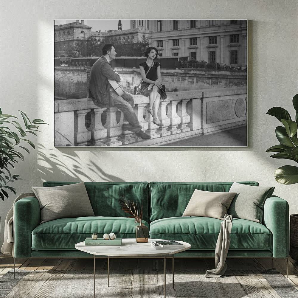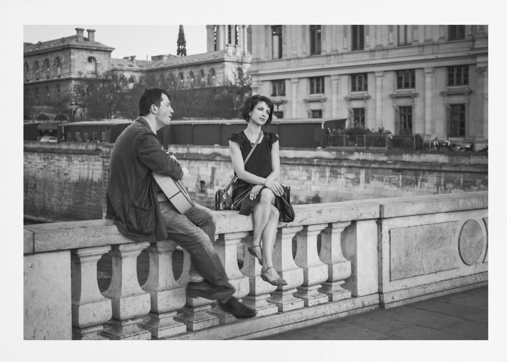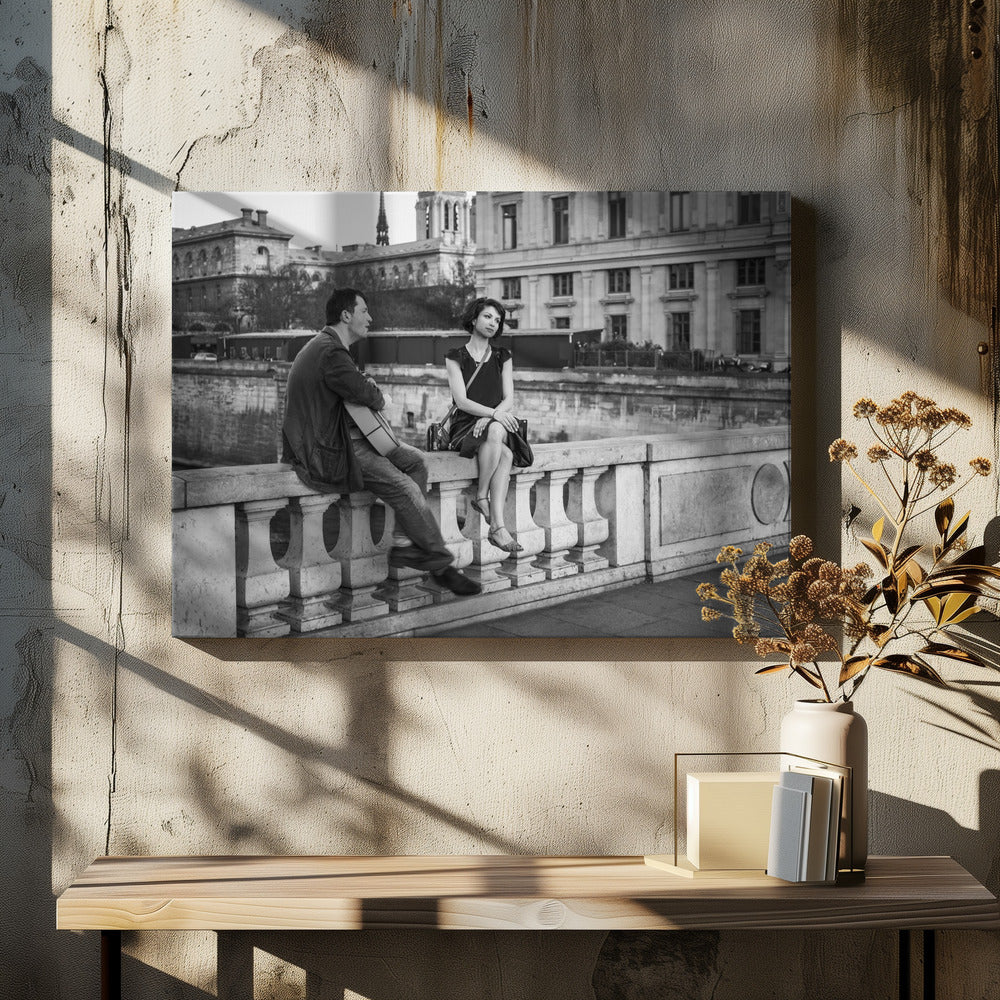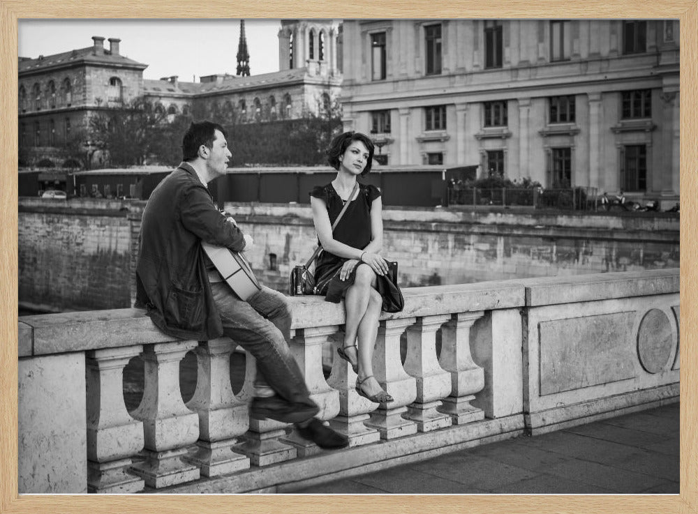 Walde Jansky presenterar Chanson D'Amour, en fängslande affisch som fångar en intim stund på en livlig Parisgata. Denna konstnärliga bild skildrar ett par, djupt försjunkna i kärlek och musik, där gitarren blir en bro mellan deras själar. Janskys förmåga att förmedla känsla och atmosfär är tydlig i varje penseldrag, vilket gör detta verk till ett tidlöst tillskott i varje hem.