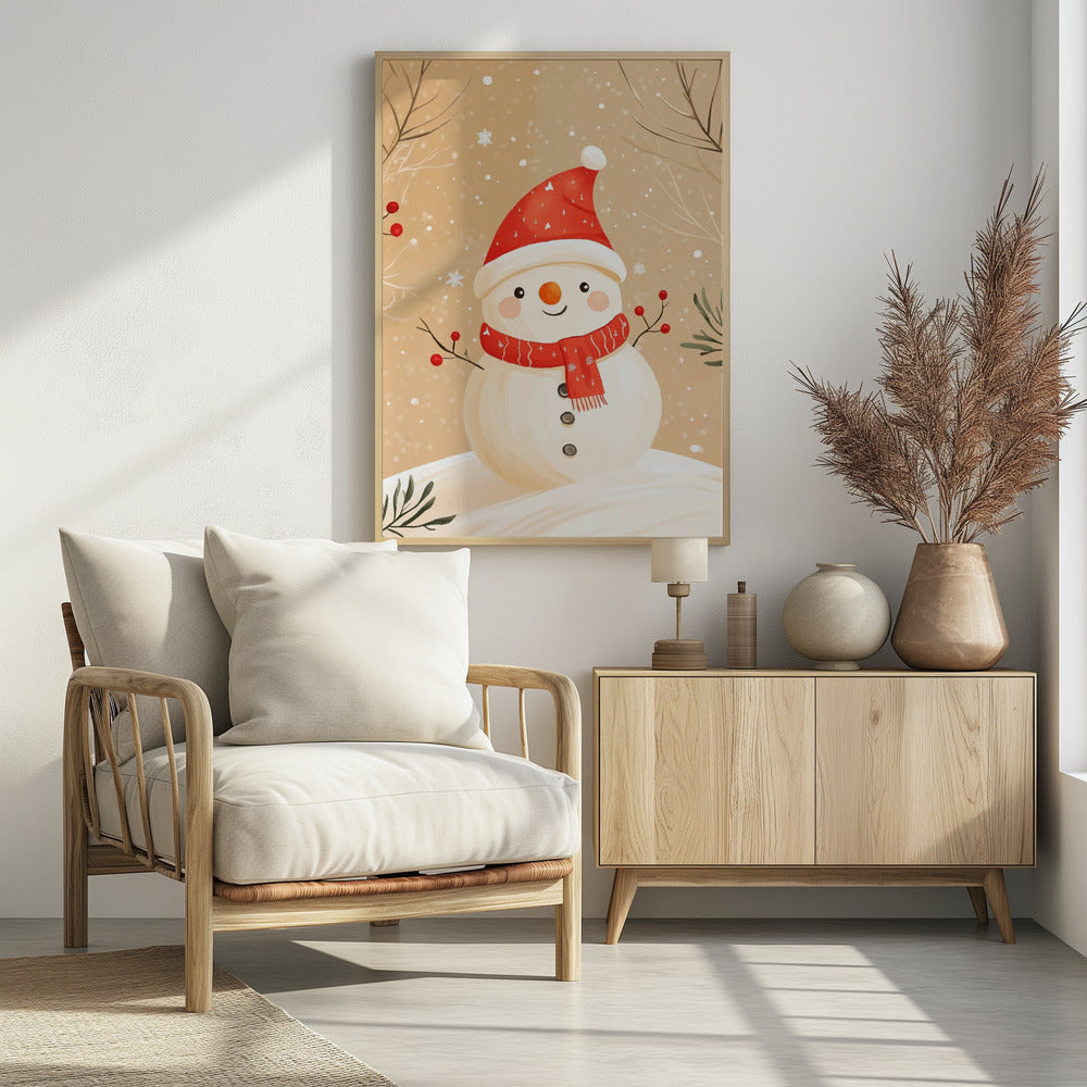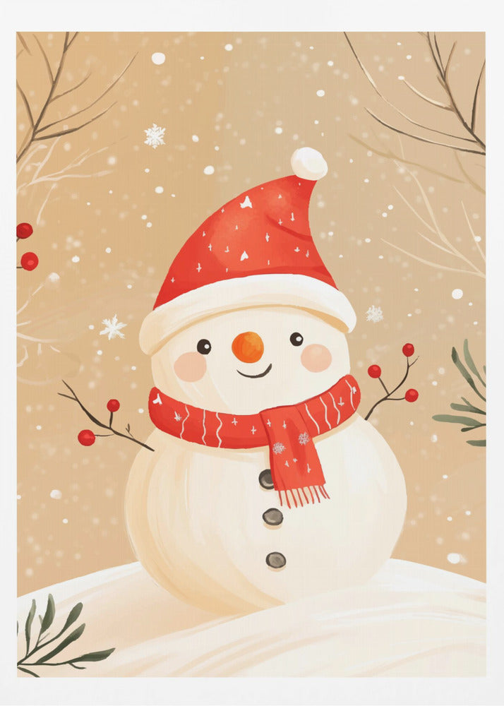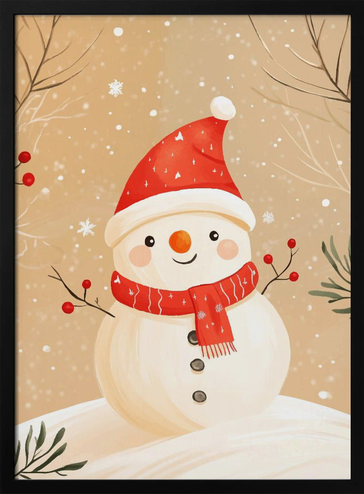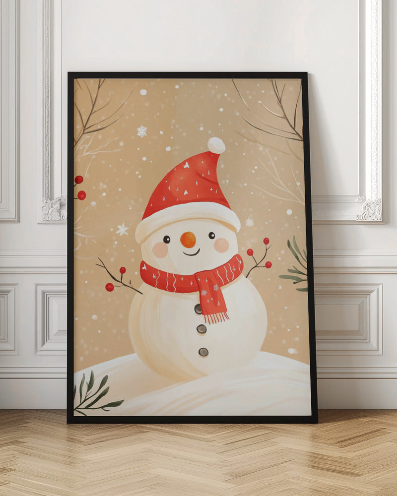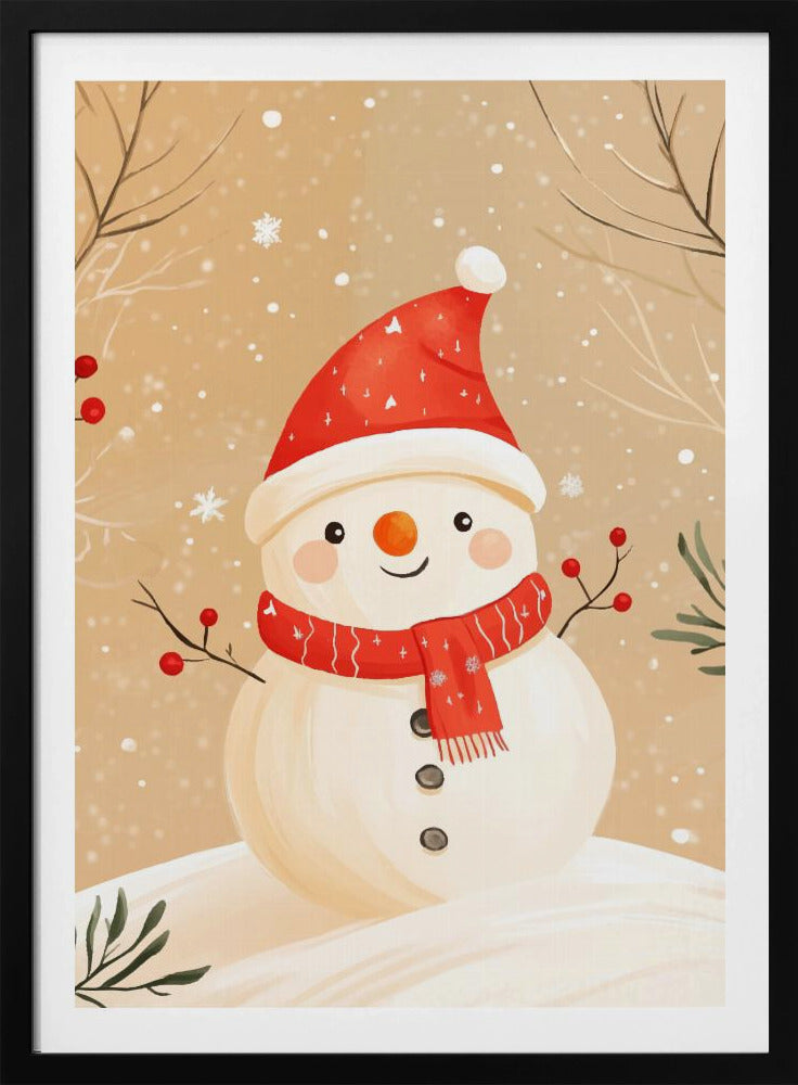 Denna charmiga affisch av Andreas Magnusson fångar vintermagin perfekt med en glad snögubbe, komplett med röd jultomteluva och en mysig halsduk. Snögubbens vänliga leende och de lekfulla detaljerna sprider en varm och inbjudande julkänsla. Ett idealiskt konstverk för att förgylla ditt hem under vintern och julhelgen, och skapa en festlig atmosfär för alla att njuta av.