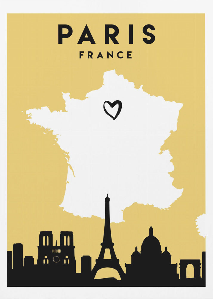 City Love Maps 64 av Emiliano Deificus är ett fängslande konstverk som hyllar Paris ikoniska stadssilhuett med en unik twist. Denna stilrena grafiska illustration väver samman arkitektur och text, där stadens namn och landmärken bildar en intrikat gul och svart kartbild. En modern och tidlös affisch som ger en känsla av urban kärlek till varje rum.