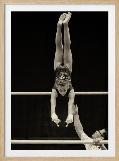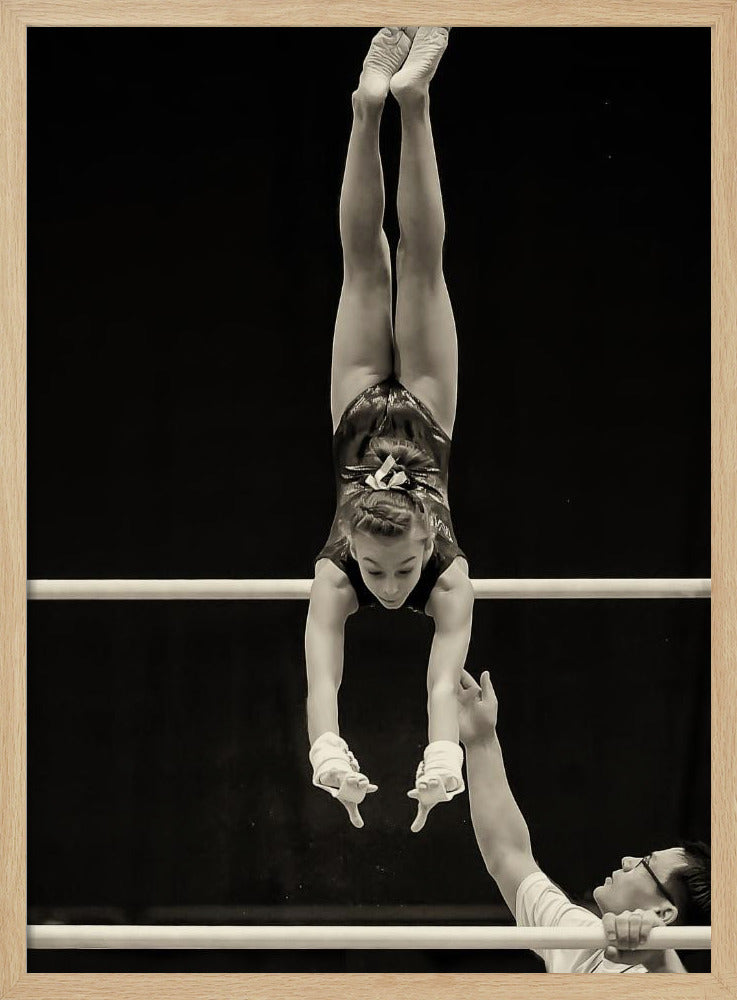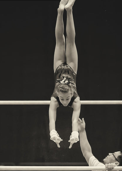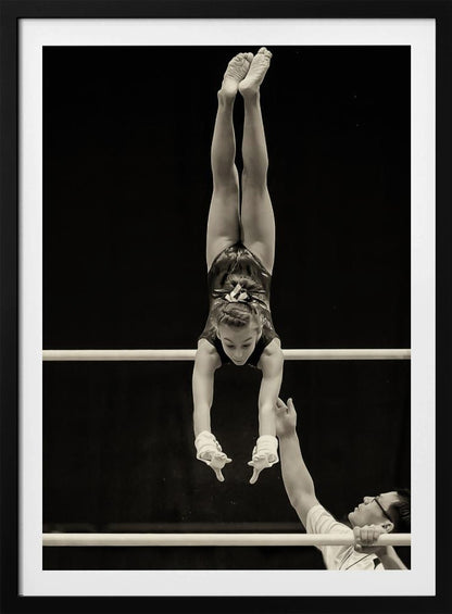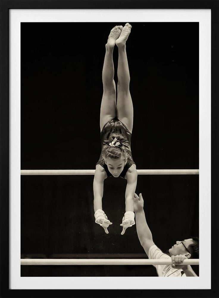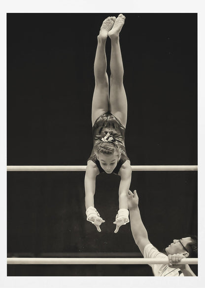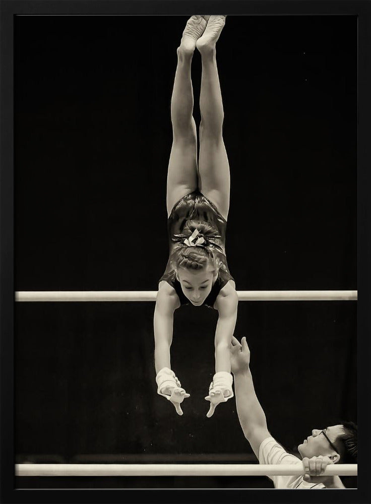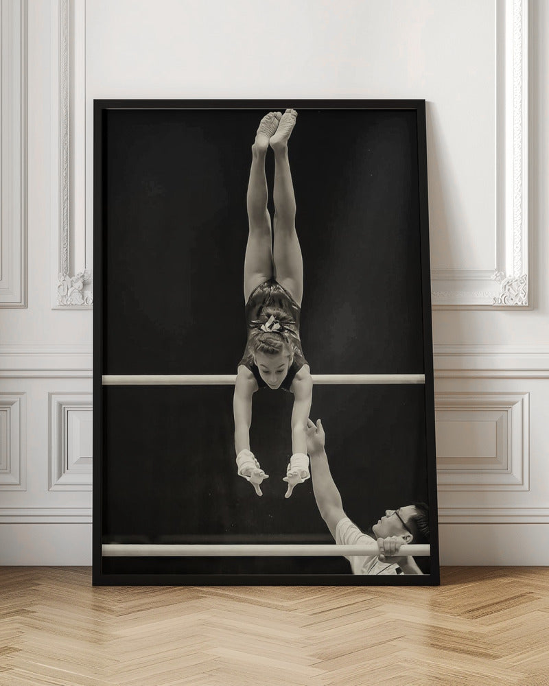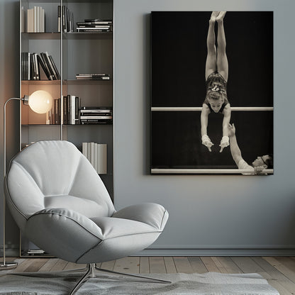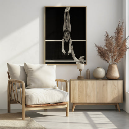 Fånga den inspirerande dynamiken i Rob Lis "Coaching" poster. Detta konstverk i svartvitt skildrar en ung gymnast i full aktion, med fokus på balans och precision. Den mörka, monokroma paletten framhäver den intensiva prestation och den enastående skicklighet som krävs i akrobatik, perfekt för att förmedla styrka och beslutsamhet.