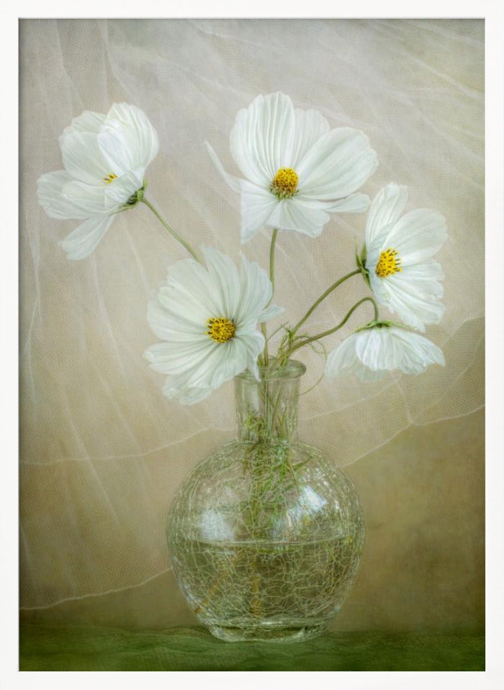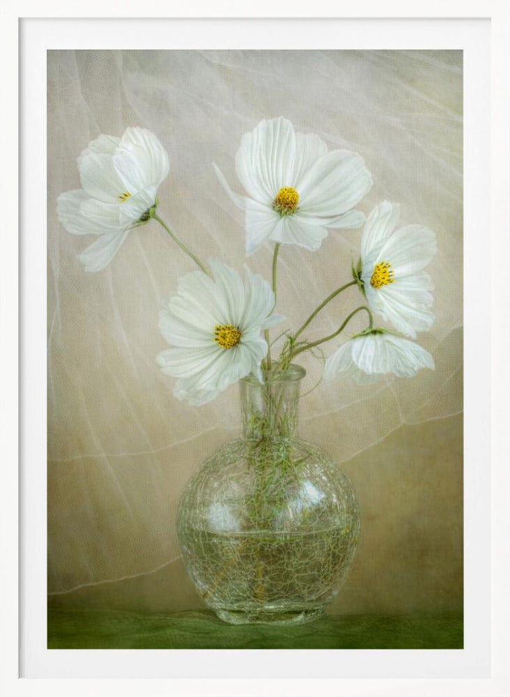 Fånga den lugna skönheten med "Cosmos breeze" av den begåvade konstnären Mandy Disher. Detta konsttryck framhäver en delikat bukett av vita cosmosblommor i en elegant grön vas, vilket skapar en känsla av stillhet och fräschör. De mjuka tonerna och den detaljerade kompositionen gör den till ett perfekt tillskott för att lyfta varje rum.