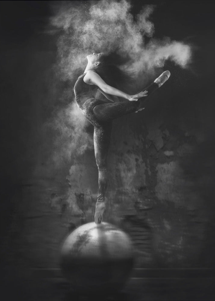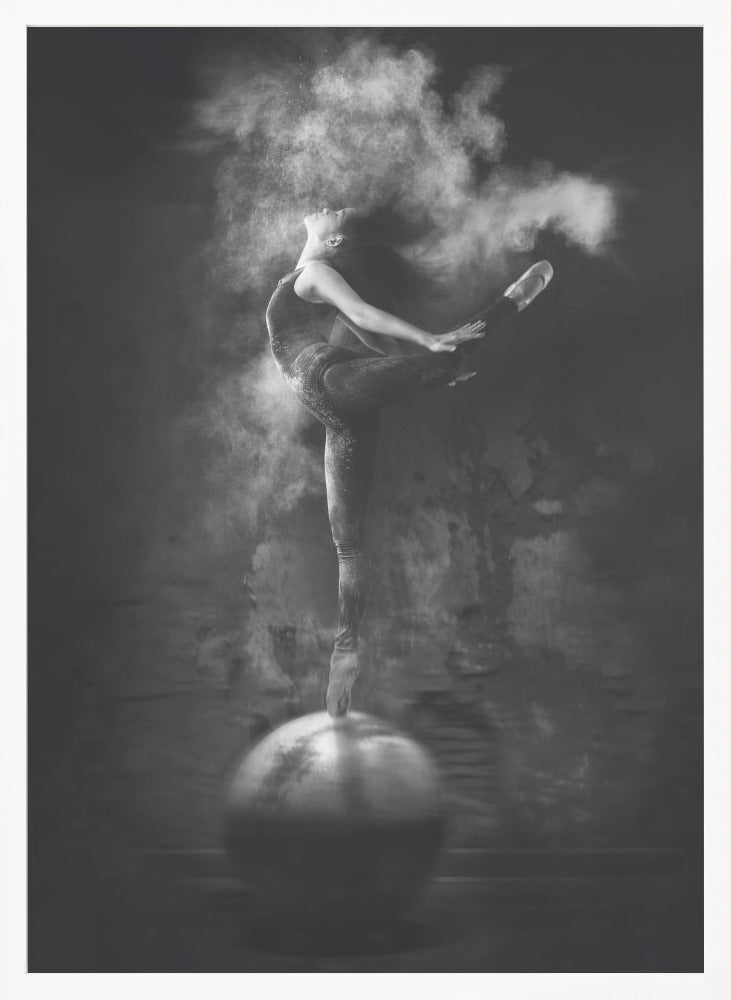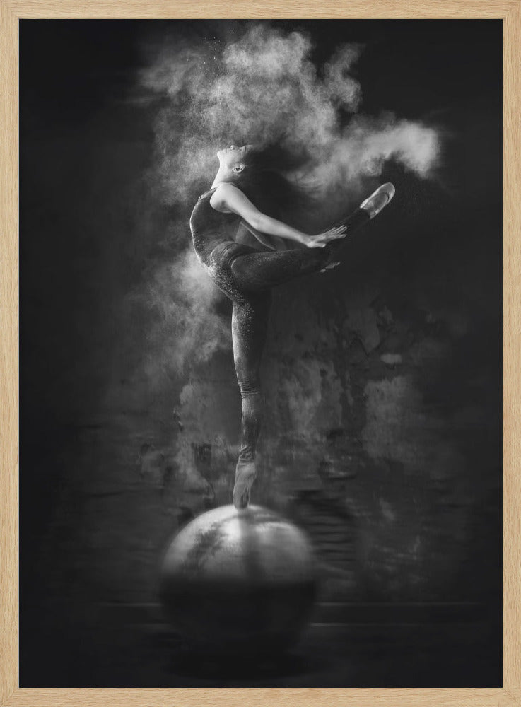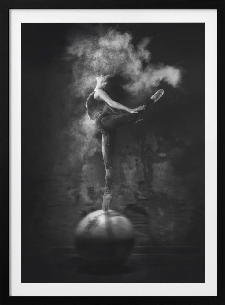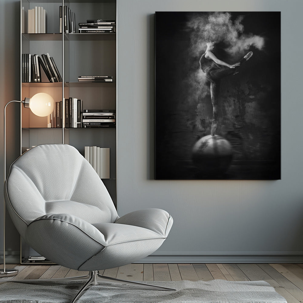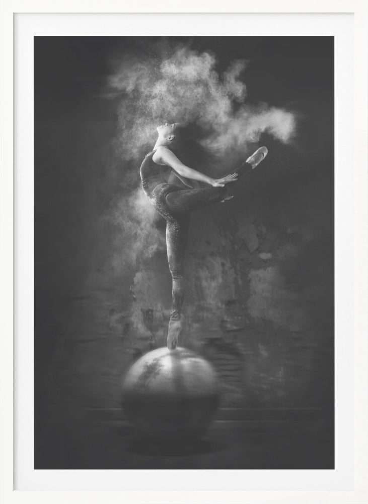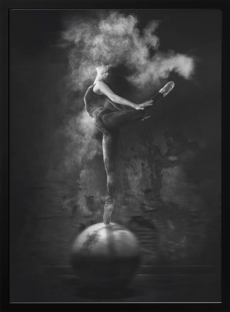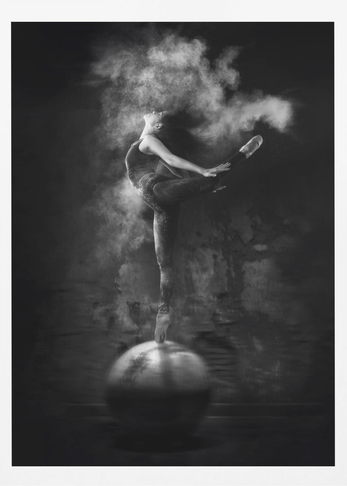 Antonyus Bunjamins (Abe) konstverk "Dance on Ball" fångar en ballerinas graciösa balans i ett ögonblick av intensiv rörelse. Denna svartvita poster framhäver kontrasten mellan dansaren och en dimmig bakgrund, där mjöl eller damm skapar en dramatisk effekt som accentuerar varje rörelse och posering.