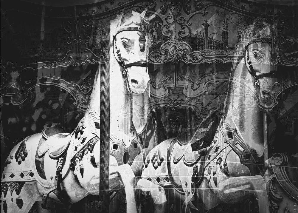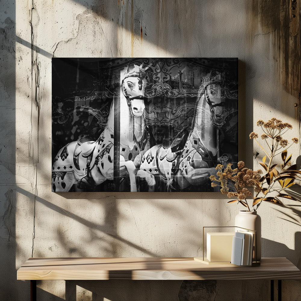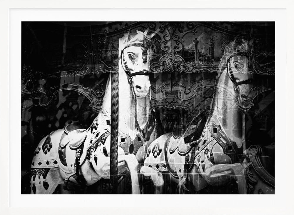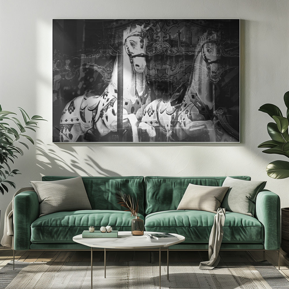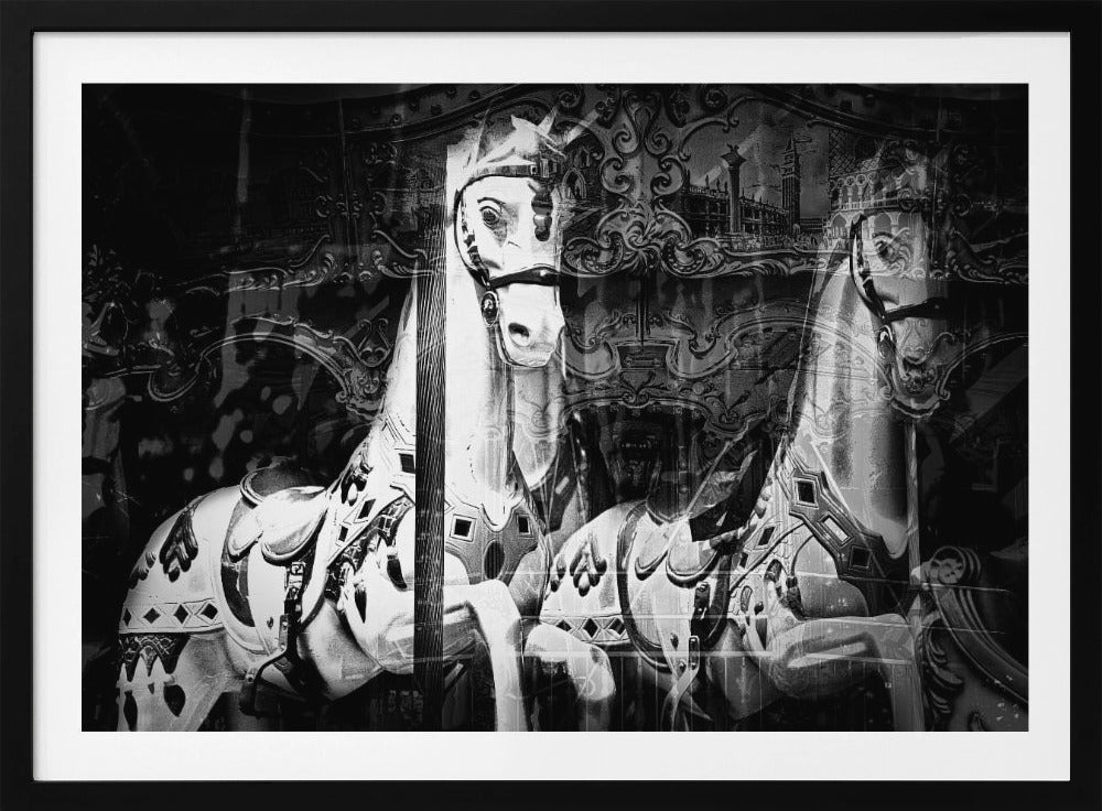 Låt dig förtrollas av Angel Julies unika affisch "Dream of Carousel", ett mästerverk som fångar barndomens magi och karusellens tidlösa charm. Denna fängslande design använder dubbelexponering i svartvitt för att skapa en drömlik och mystisk atmosfär, där hästar och människor smälter samman i en poetisk dans. Perfekt för den som älskar konst med djup och en touch av nostalgi.