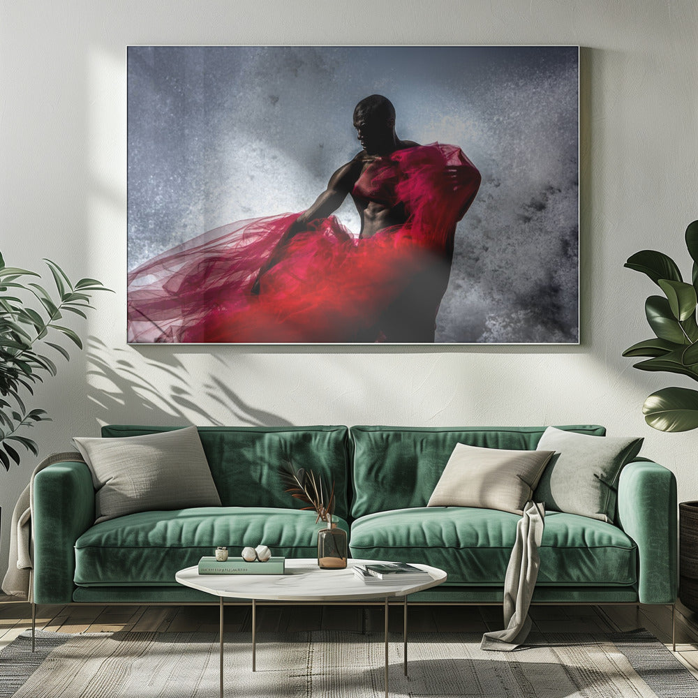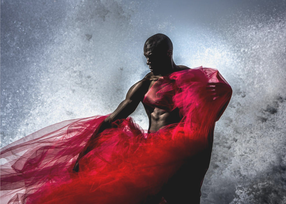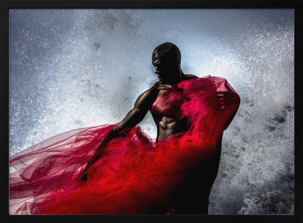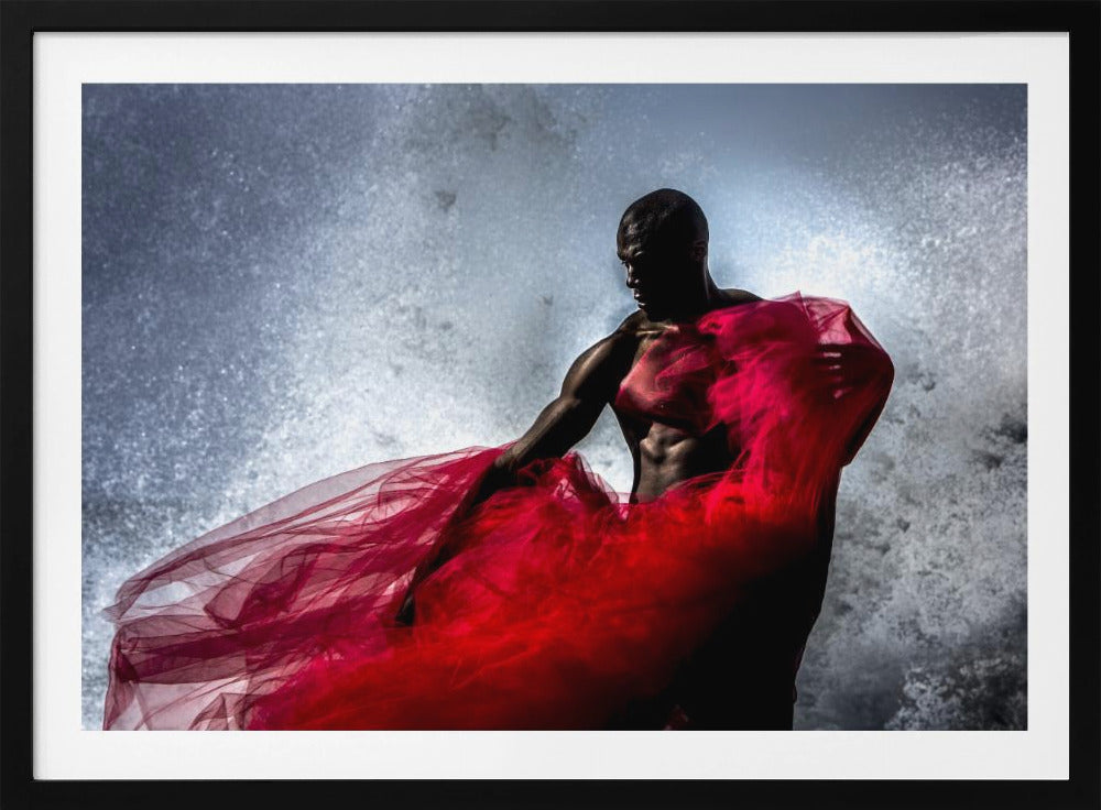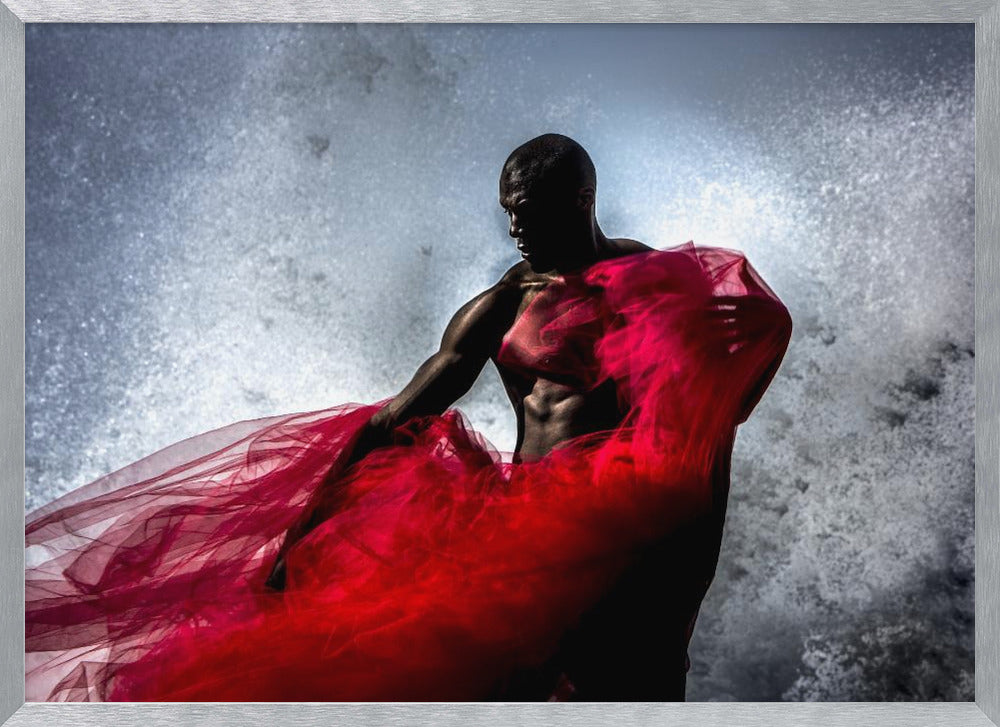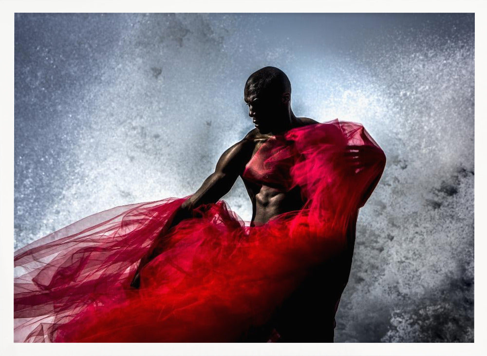 Peter Müller Photography presenterar "Fire and Water", en fängslande affisch som utforskar kontrasten mellan element och mänsklig form. Bilden visar en stark svart man, draperad i rött tyg, som möter havets vågor. Det dramatiska stänket av vatten och tygets flöde skapar en dynamisk och konstnärlig komposition som fångar ögat.