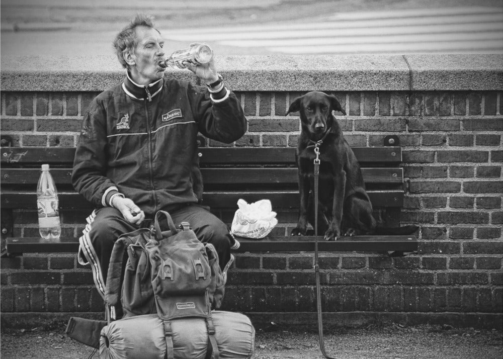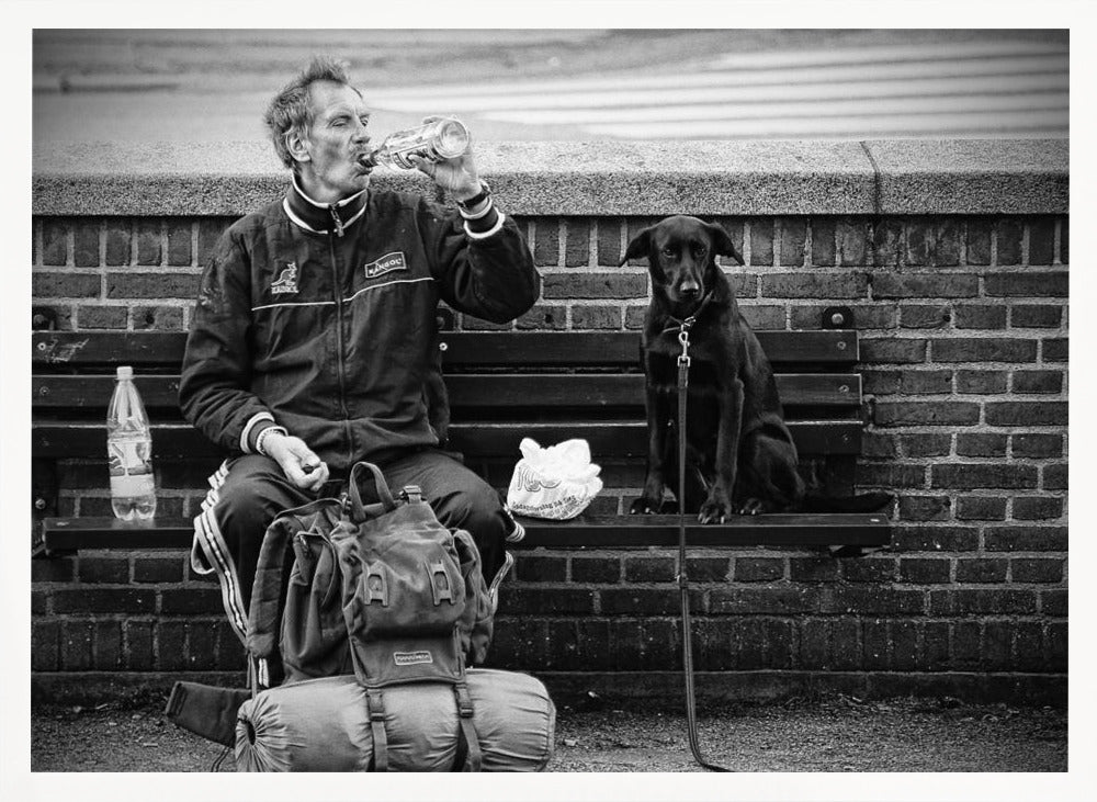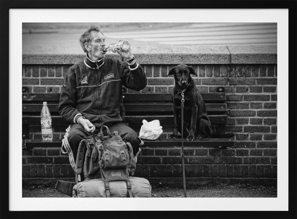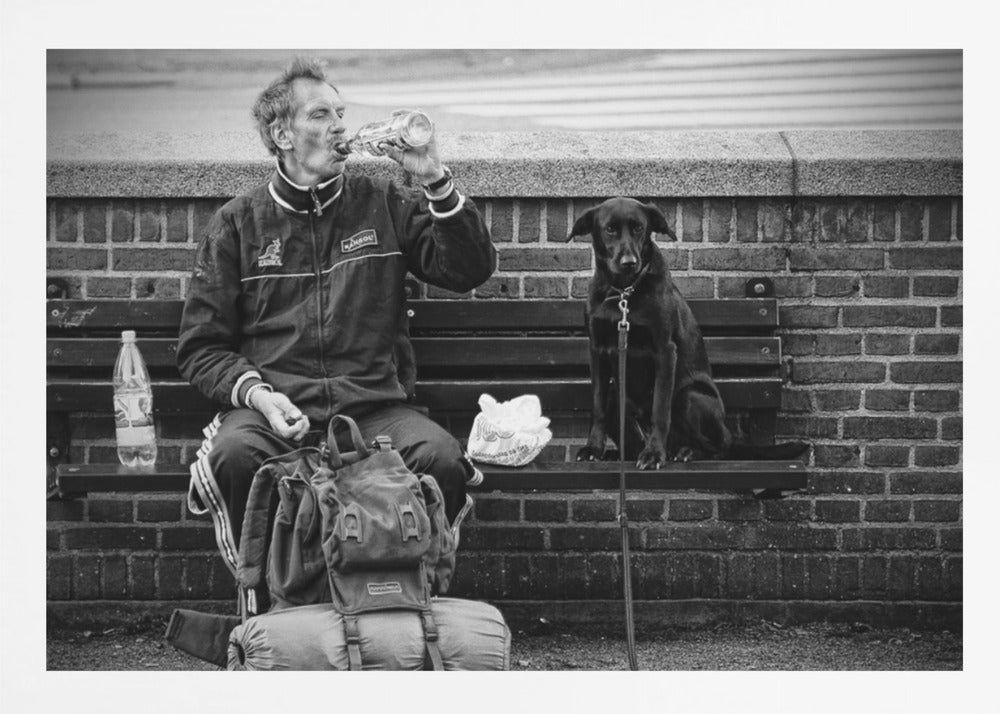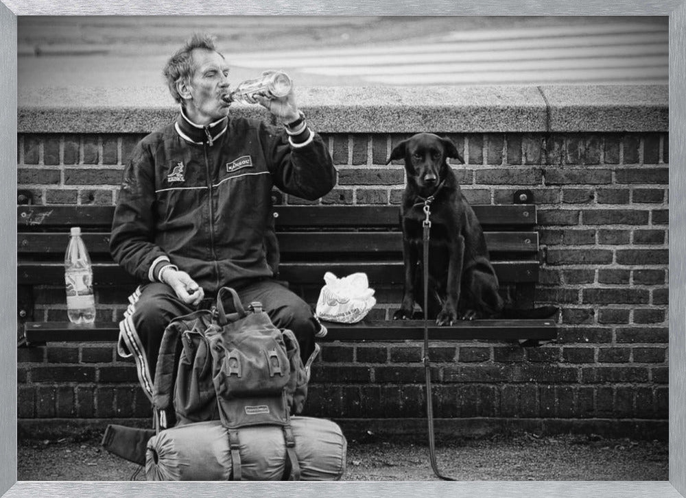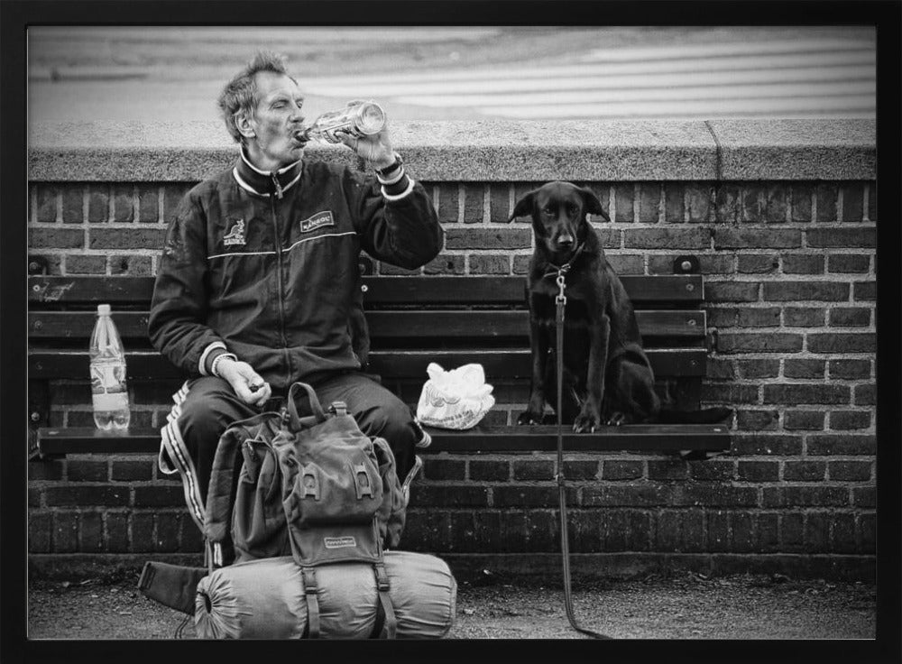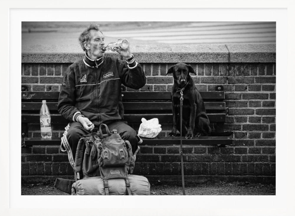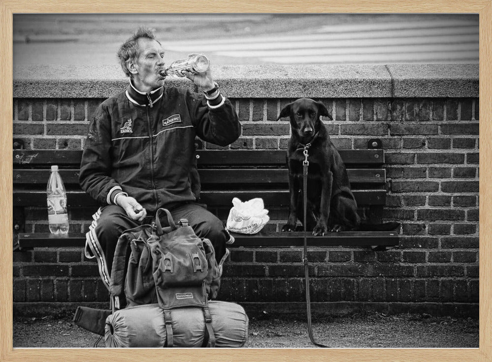 Stefan Nielsens "Friends" är en hjärtvärmande poster som fångar ett ögonblick av ren vänskap i Köpenhamn. Se två charmiga hundar dela en flaska dryck på en bänk, medan en man med ryggsäck diskret observerar dem. Detta konstverk är en perfekt blandning av humor och ömhet, med en unik stil som verkligen berör.