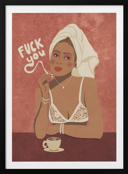 Dyk in i den djärva världen av Raissa Oltmanns med denna slagkraftiga poster, "Fuck you". Verket porträtterar en kvinna med en kaxig attityd, kaffe i handen och rök ringlande från cigaretten. Den digitala konsten kombinerar figurativa element med starka, röda toner, vilket skapar ett motiverande och inspirerande uttryck av oberoende och självacceptans. En modern tolkning av "sorry not sorry" och "girl power".