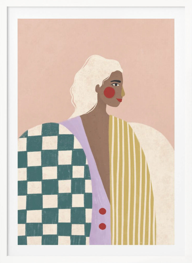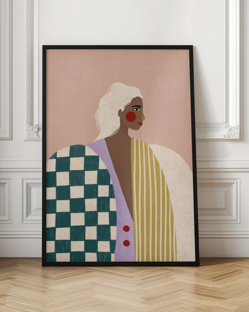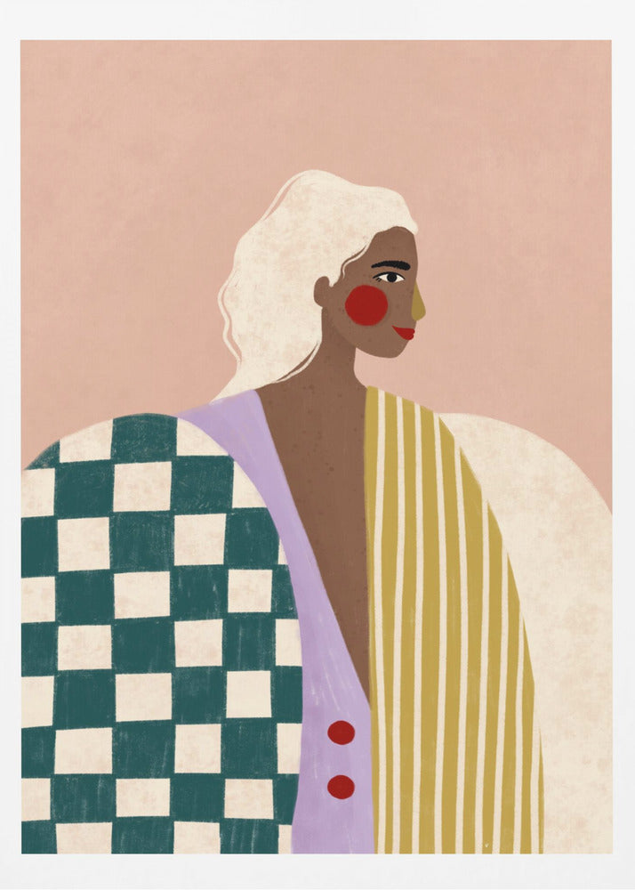 Motivet visar en kvinna i en randig blus med schackrutiga detaljer, presenterad med en modern och grafisk illustration mot en rosa bakgrund. Det figurativa porträttet utstrålar mode och personlighet, perfekt för att sätta en trendig touch på ditt hem.