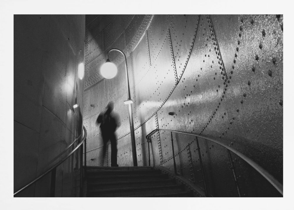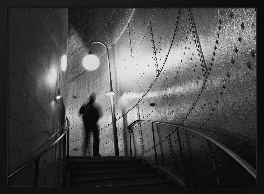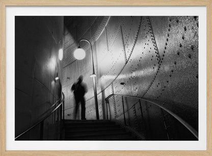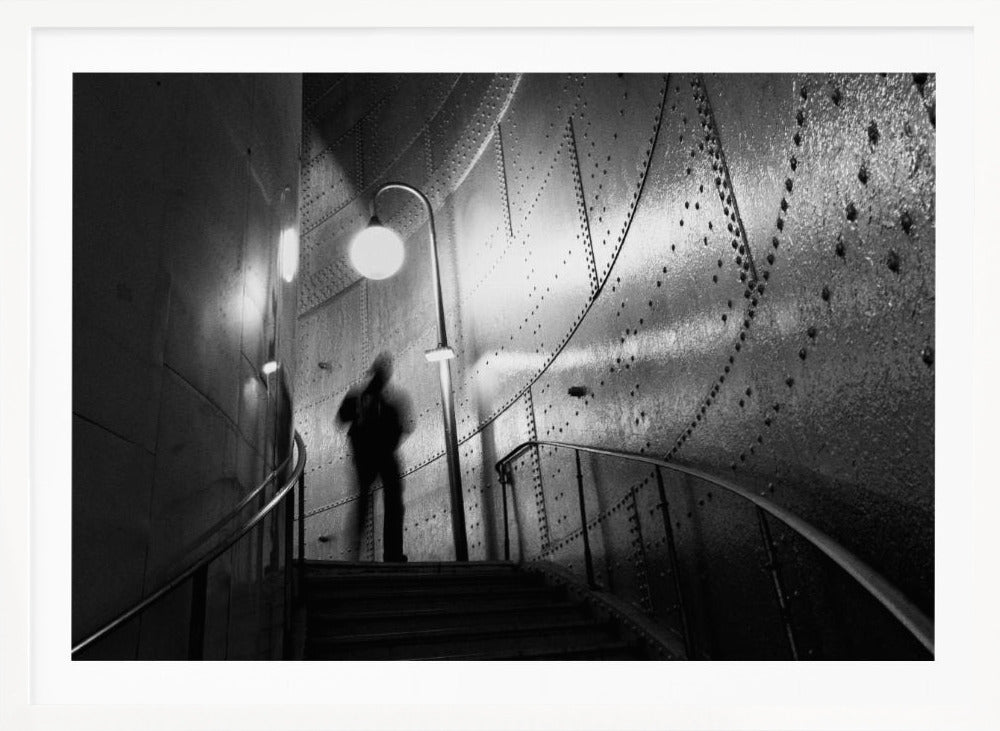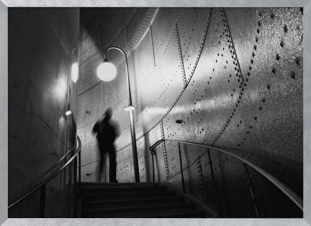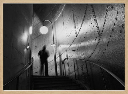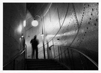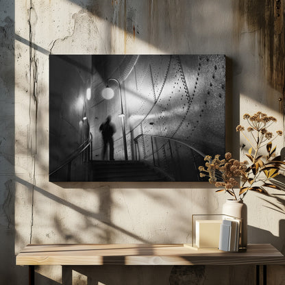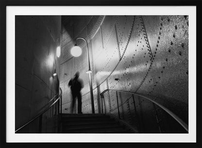 Denna fängslande poster, skapad av Art Lionse, fångar en stämningsfull scen från Paris tunnelbana. En ensam figur vandrar genom skuggorna, badad i gatubelysningens sken, vilket skapar en känsla av mystik och reflektion. Det svartvita motivet framhäver silhuetternas dramatik och rummets djup, en tidlös skildring av urban melankoli.