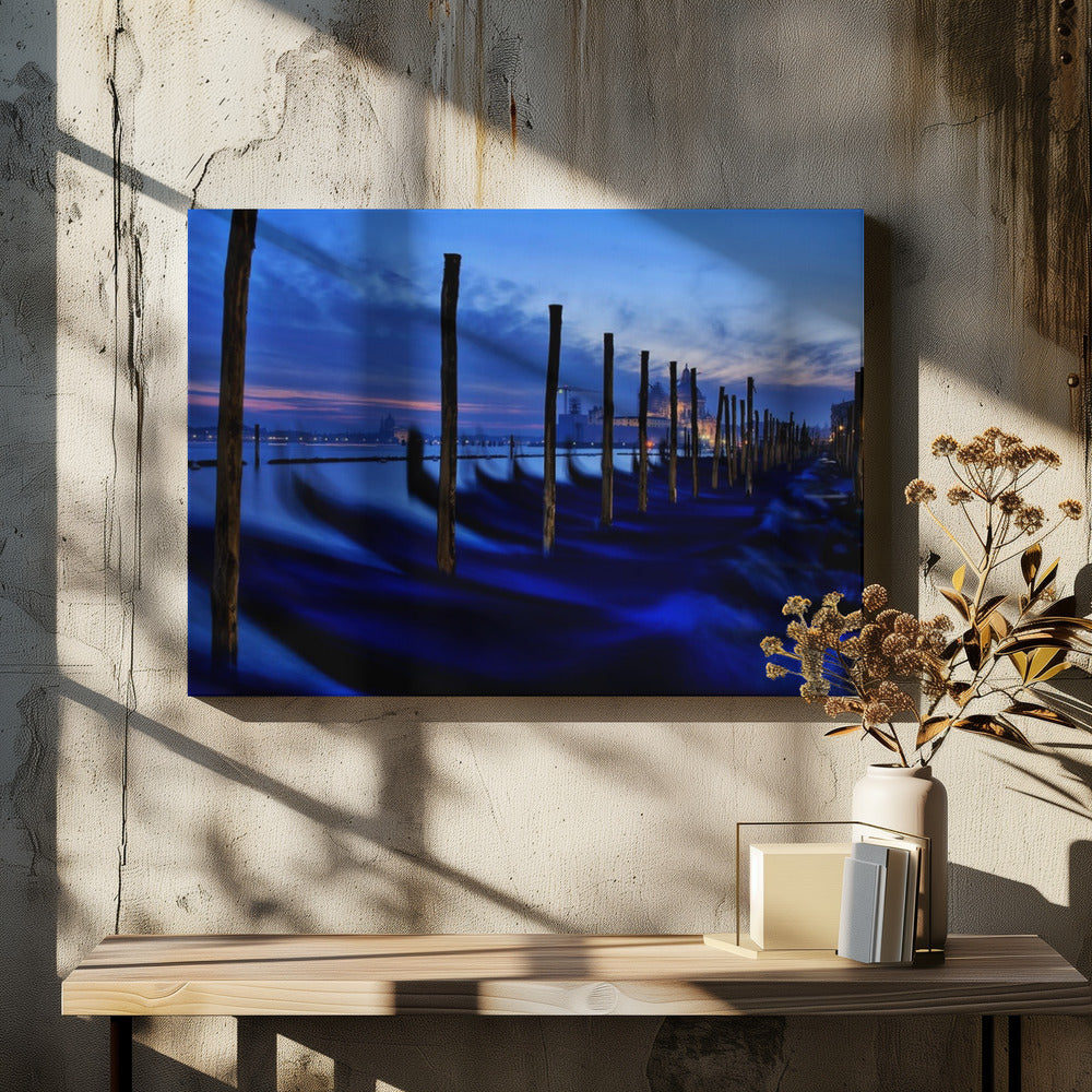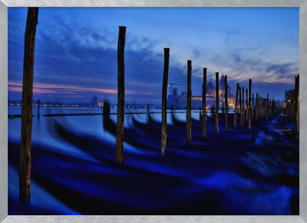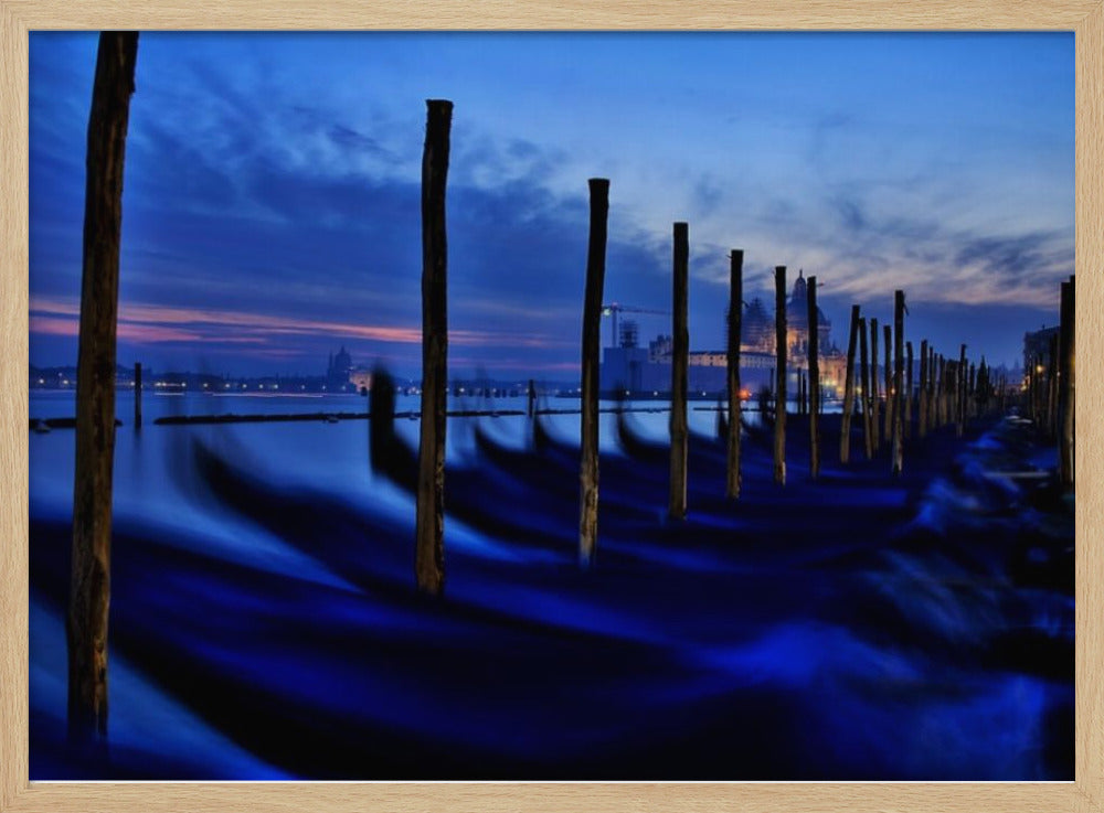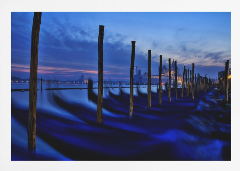 Denna fängslande poster, "ghosting", av Ferry Kana fångar Venedigs mystiska nattliga skönhet. Med sina blåtonade nyanser och speglingar i kanalen skapas en drömsk och rofylld atmosfär. En ensam gondol glider tyst förbi, omgiven av stadens ikoniska arkitektur under en stjärnklar himmel. Det är ett perfekt konstverk för att föra in lugn och en känsla av äventyr i ditt hem.