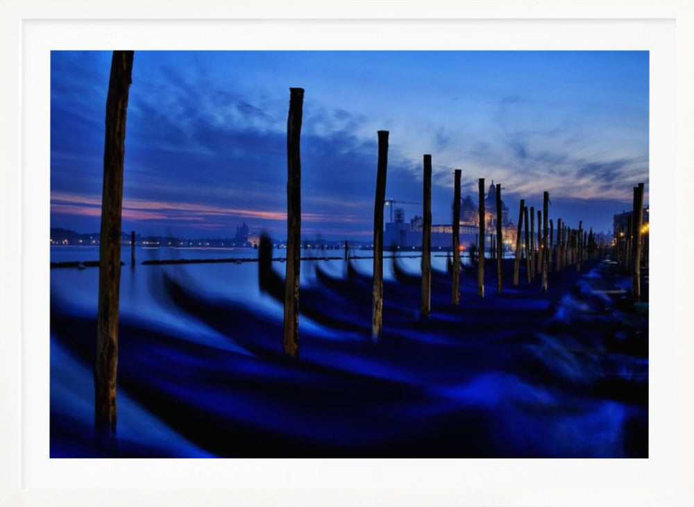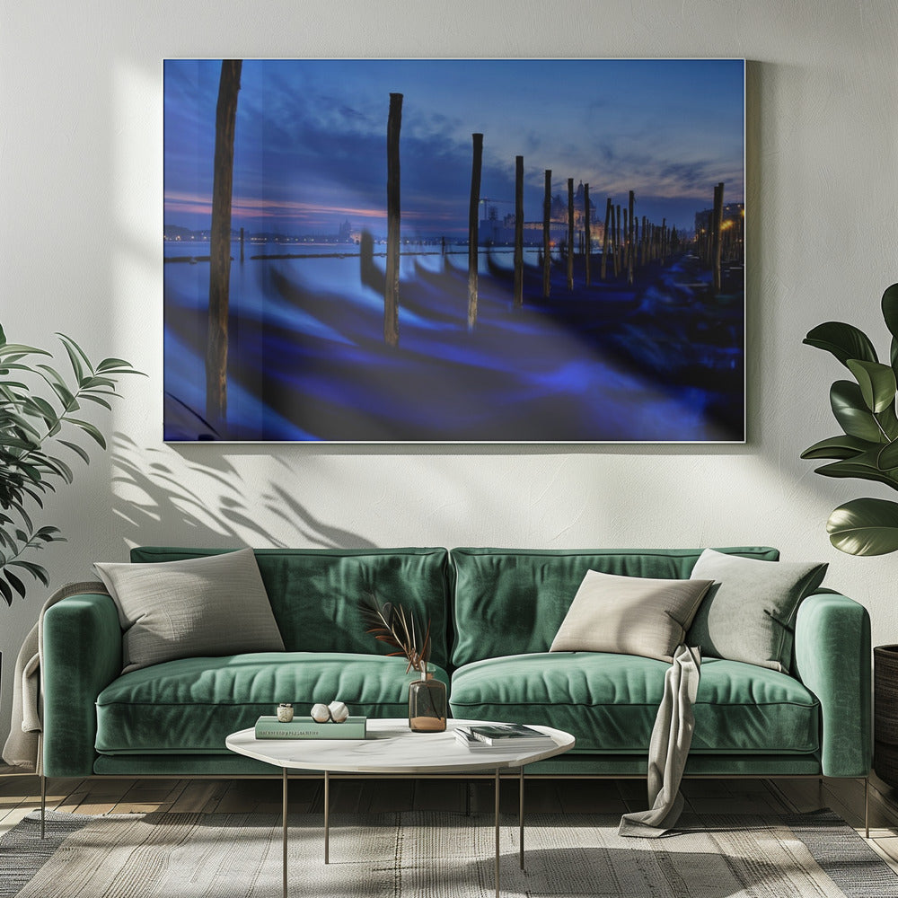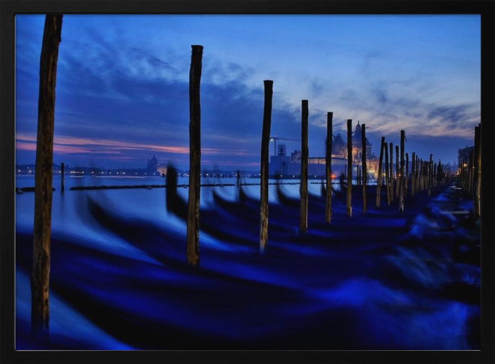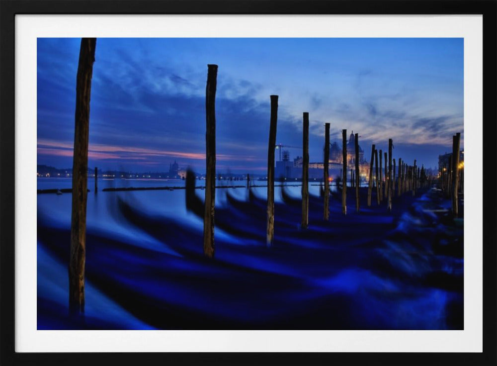 Denna fängslande poster, "ghosting", av Ferry Kana fångar Venedigs mystiska nattliga skönhet. Med sina blåtonade nyanser och speglingar i kanalen skapas en drömsk och rofylld atmosfär. En ensam gondol glider tyst förbi, omgiven av stadens ikoniska arkitektur under en stjärnklar himmel. Det är ett perfekt konstverk för att föra in lugn och en känsla av äventyr i ditt hem.