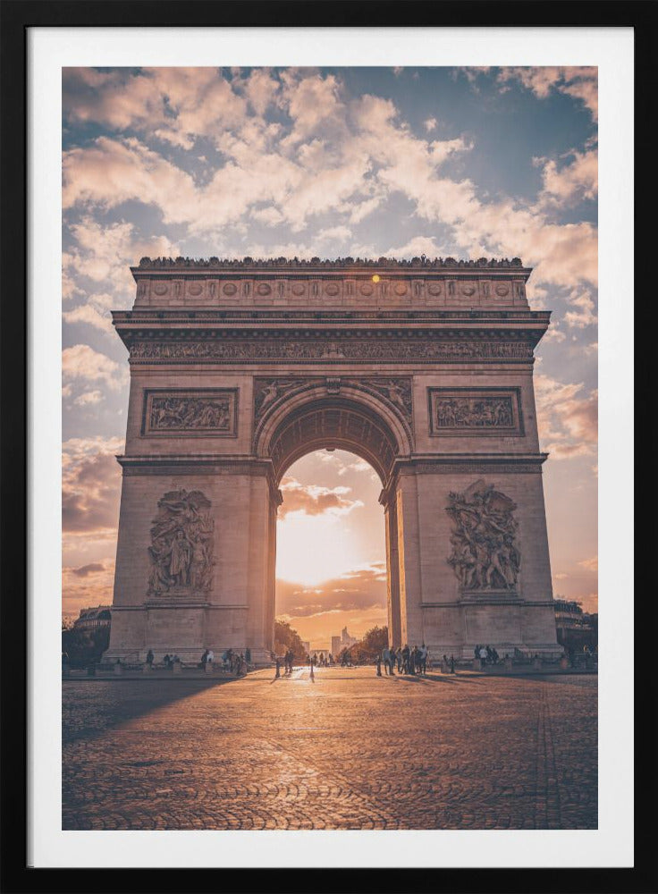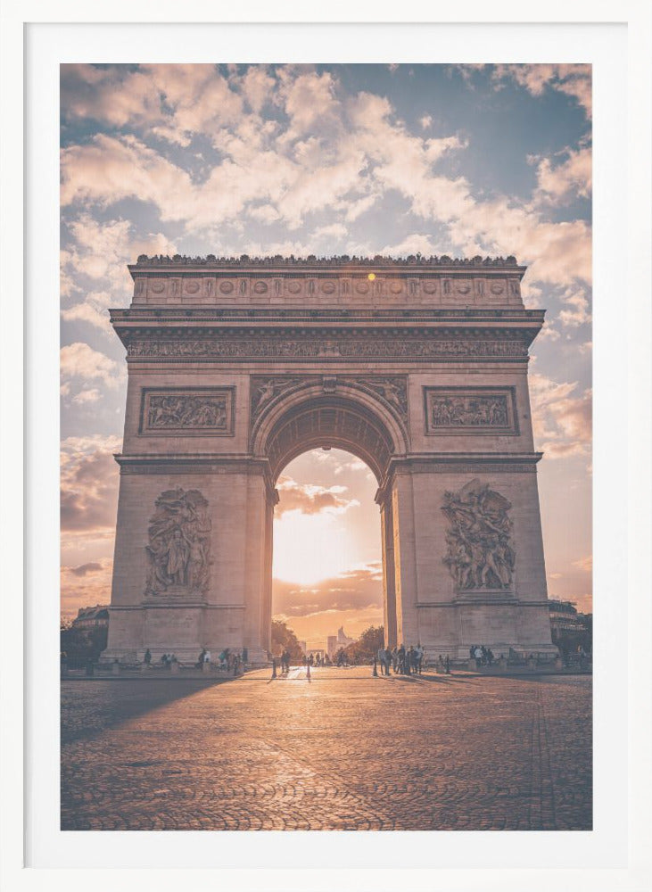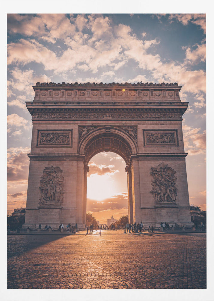 Denna fantastiska poster, skapad av konstnären Behdad Pournader, fångar den ikoniska Triumfbågen i Paris under en magisk gyllene timme. Ett varmt ljus badar över den storslagna arkitekturen och himlen, medan människor samlas i förgrunden, vilket skapar en känsla av liv och rörelse. Ett tidlöst konstverk som förvandlar varje vägg.