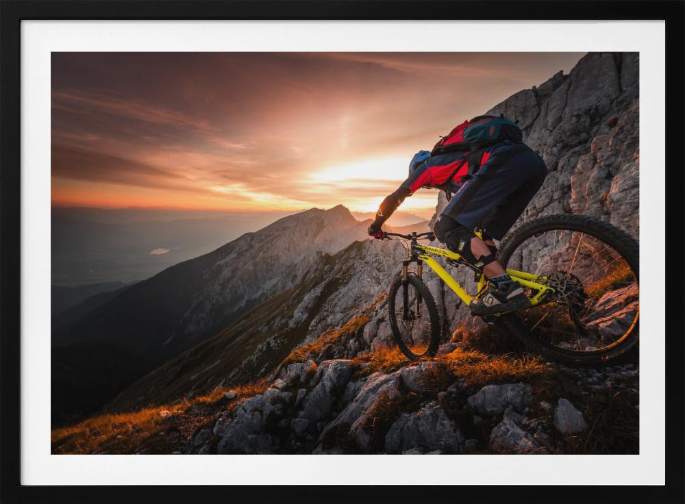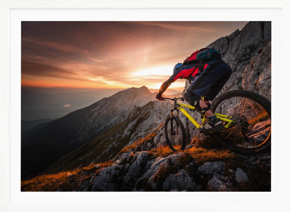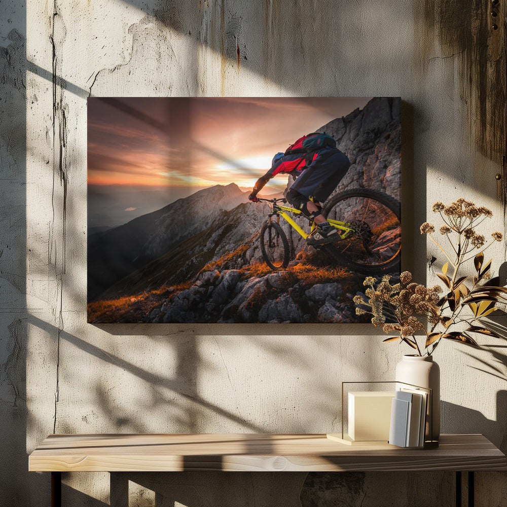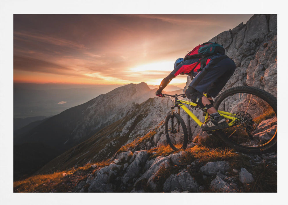 Fånga den magiska känslan med Sandi Bertonceljs konstverk "Golden hour high alpine ride". Detta dynamiska motiv skildrar en mountainbiker i full fart under solnedgångens varma ljus i Alperna. En hyllning till äventyr, frihet och den otroliga skönheten i berglandskapet vid skymningen. Känn adrenalinet och dröm dig bort till nya höjder.