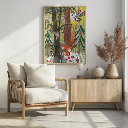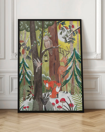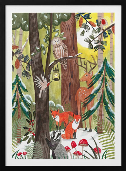 Fängslas av den förtrollande julskogen från Caroline Bonne Müller, en magisk poster och tavla där djuren firar jul i ett snöigt vinterlandskap. Här dansar en räv, en hjort, en grävling och ugglor bland snötäckta grankvistar och skimrande kottar. Denna sagolika illustration skapar en varm och fridfull julkänsla i ditt hem.