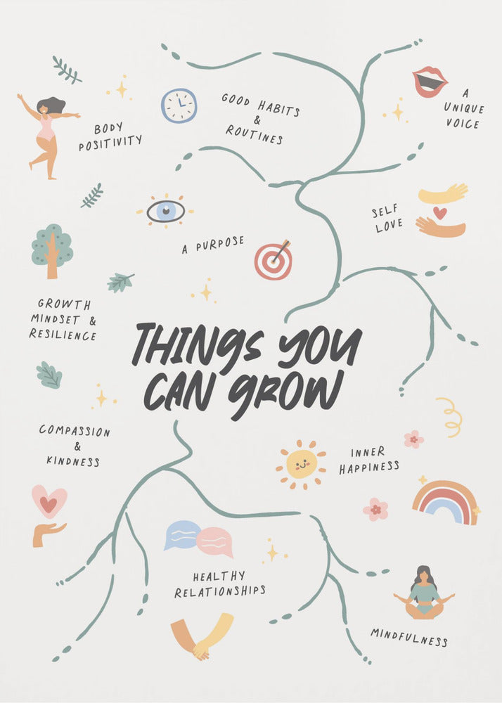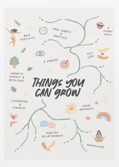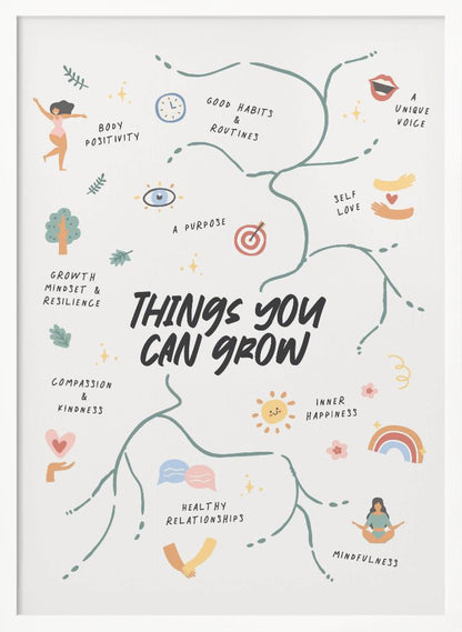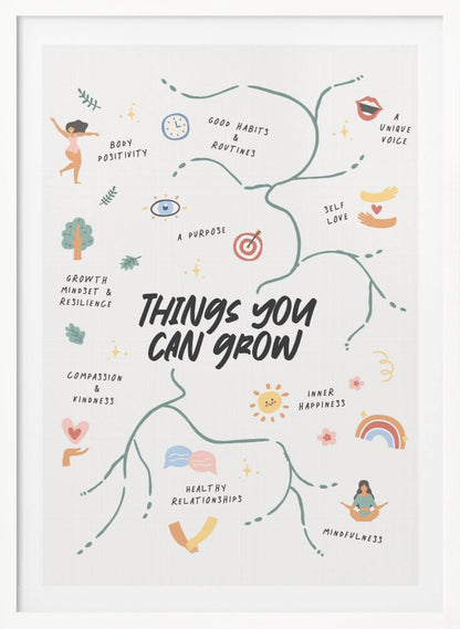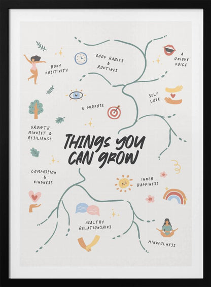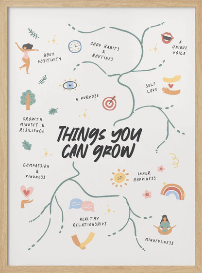Upplev den sprudlande glädjen och inspirationen med "Grow" postern från KsanaKalpa. Denna färgstarka och grafiska konstnärliga bild använder en livfull palett för att förmedla ett positivt budskap om tillväxt och lycka. De djärva bokstäverna och det inspirerande citatet gör den till en perfekt påminnelse om att må bra och omfamna positivitet i din vardag.