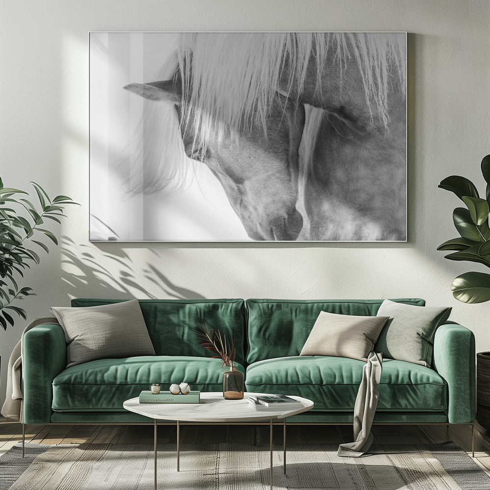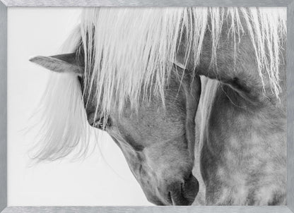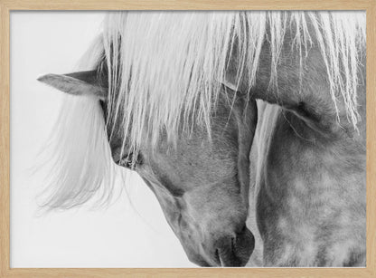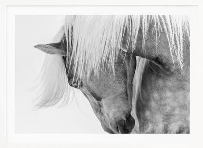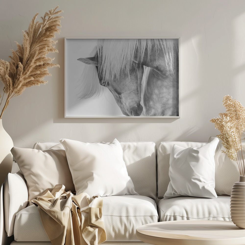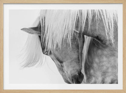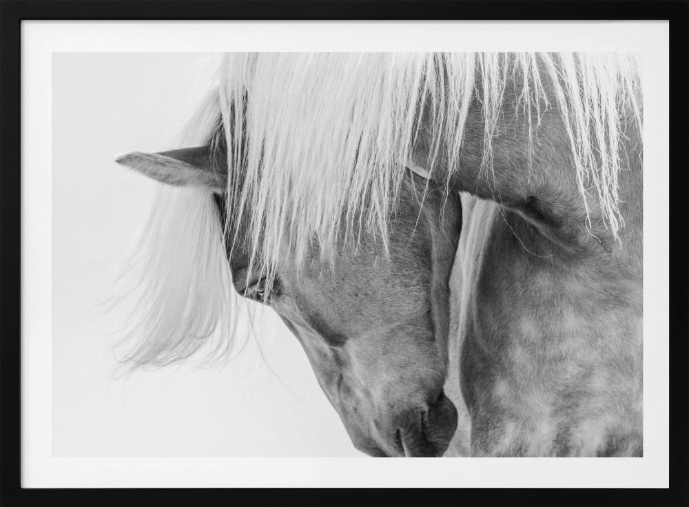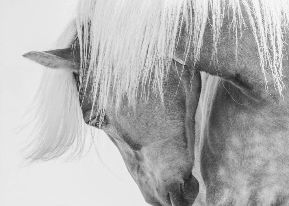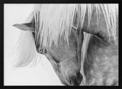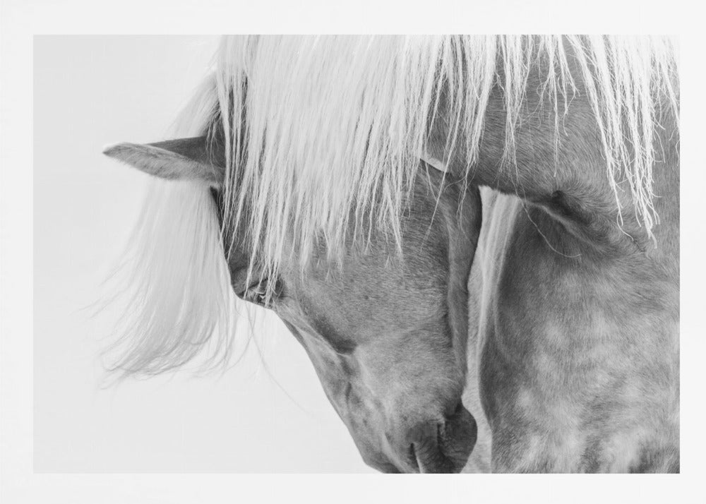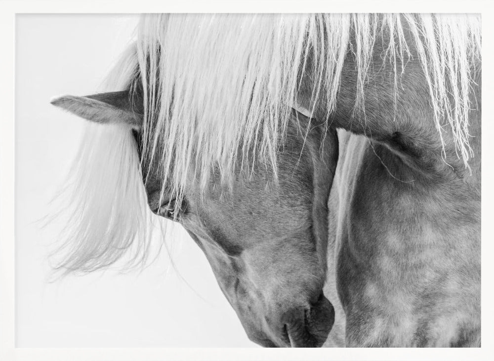 Fånga den majestätiska skönheten hos en Halflingerhäst i detta slående porträtt av Kimberly. Detta konsttryck i svartvitt lyfter fram hästens uttrycksfulla ansikte och flödande man mot en ljus, nästan drömlik bakgrund. Ett perfekt motiv för att skapa en känsla av lugn och elegans i ditt hem, oavsett om du älskar hästar eller uppskattar minimalistisk konst.