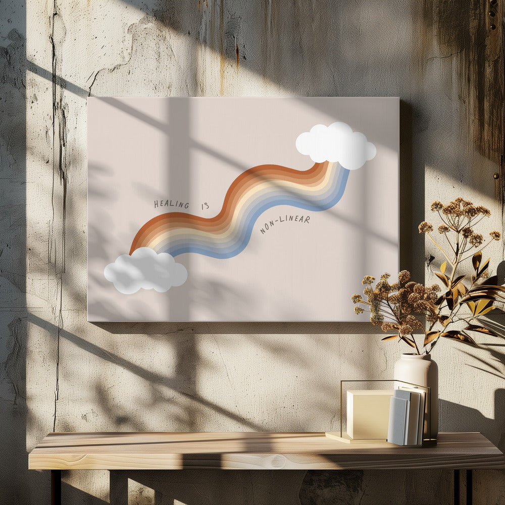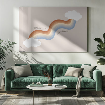 Från den talangfulla konstnären KsanaKalpa kommer "Healing Rainbow" – en inspirerande poster som sprudlar av positivitet och färg. Denna grafiska tavla med text och citat använder en lekfull regnbåge och moln för att förmedla ett budskap om kärlek, lycka och tillväxt. Ett färggrant och må-bra-konstverk som tillför terapi och mindfulness i varje rum.
