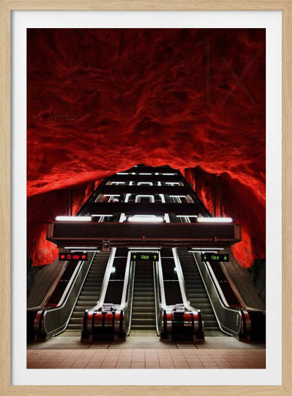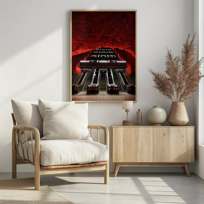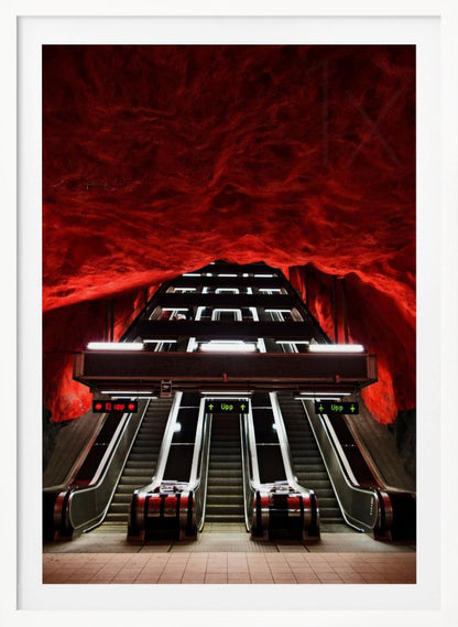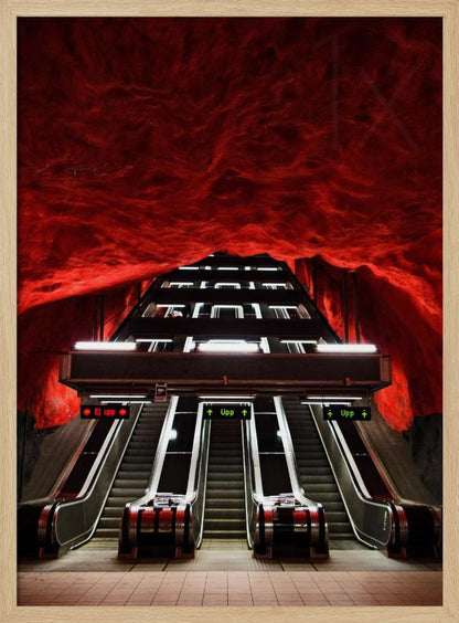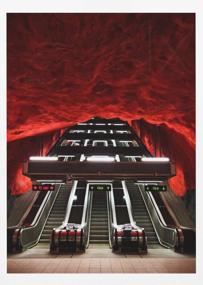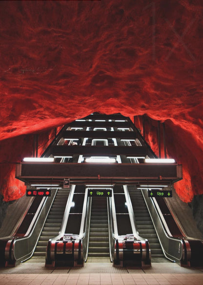Skapad av YY, tar denna dramatiska poster dig till Solna Centrums tunnelbanestation i Stockholm, känd för sin unika arkitektur. Den iögonfallande röda grottliknande ingången, som gett stationen smeknamnet "Hell's Mouth", fångas här med en modern och kraftfull estetik. Denna bild är ett perfekt konstverk för den som uppskattar både stadslandskap och djärv design.