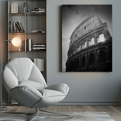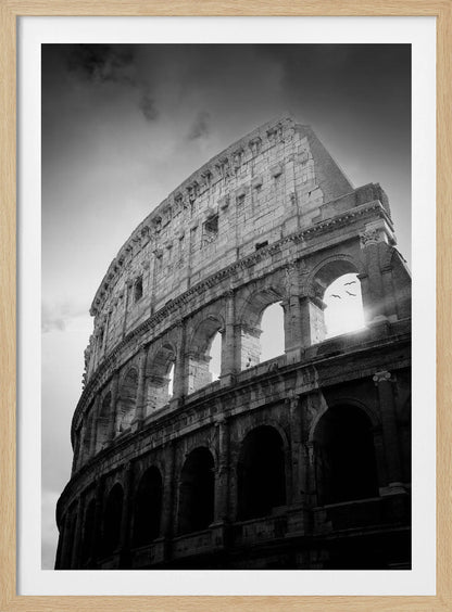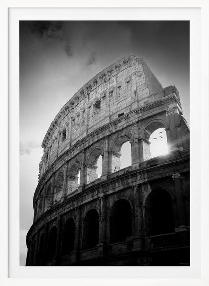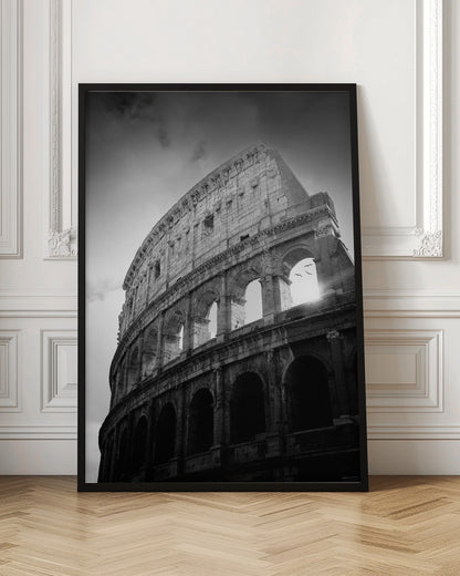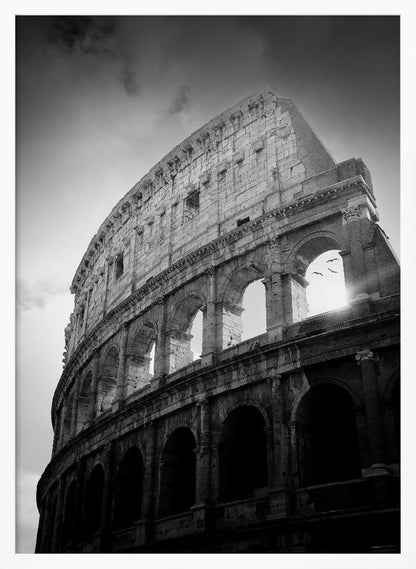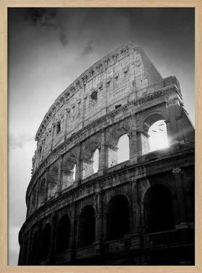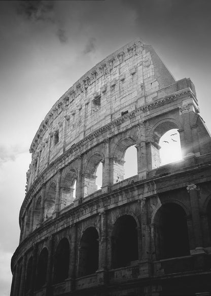 Denna fängslande poster, skapad av konstnären Martyn Large, fångar det ikoniska Kolosseums storslagenhet. Genom en tidlös svartvit estetik framhävs den historiska byggnadens dramatiska arkitektur och dess ruiner berättar historier från antiken. Fåglarna som flyger över tillför liv och rörelse, vilket skapar en dynamisk och konstnärlig känsla som passar perfekt i varje rum.